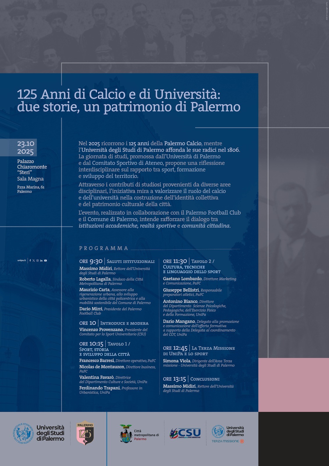 Giovedì 23 ottobre 2025, alle ore 9:00, alla Sala Magna del Complesso Monumentale dello Steri (piazza Marina, 61), si terrà l’evento “125 anni di calcio e di Università: due storie, un patrimonio di Palermo”, promosso dall’Università degli Studi di Palermo e dal Comitato Sportivo di Ateneo, in collaborazione con il Palermo Football Club e il Comune di Palermo.