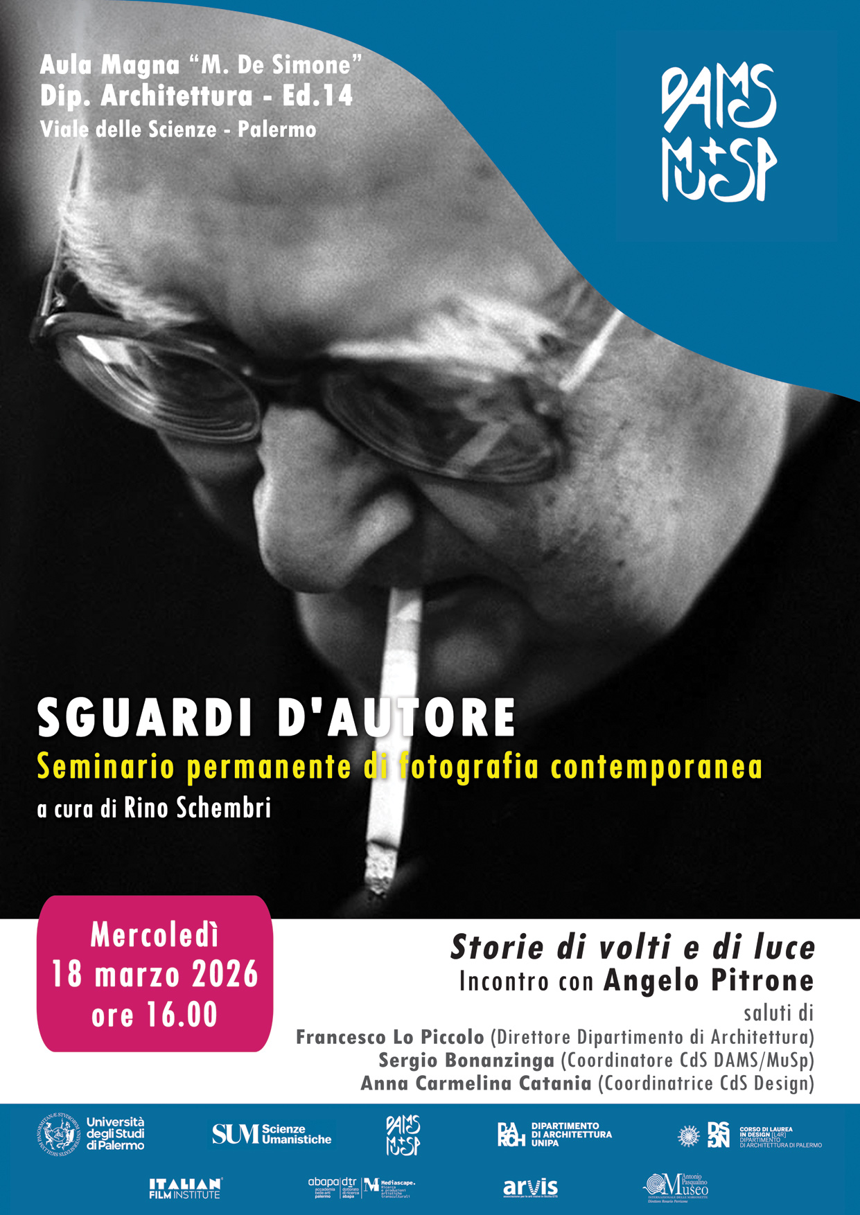 Mercoledì 18 marzo alle ore 16:00 prende il via il ciclo di incontri Sguardi d’autore. Seminario permanente di fotografia contemporanea, a cura di Rino Schembri. L’incontro si aprirà con i saluti istituzionali di Francesco Lo Piccolo, Direttore del Dipartimento di Architettura, Sergio Bonanzinga, Coordinatore del CdS DAMS/MuSp, e Anna Carmelina Catania, Coordinatrice del CdS Design.