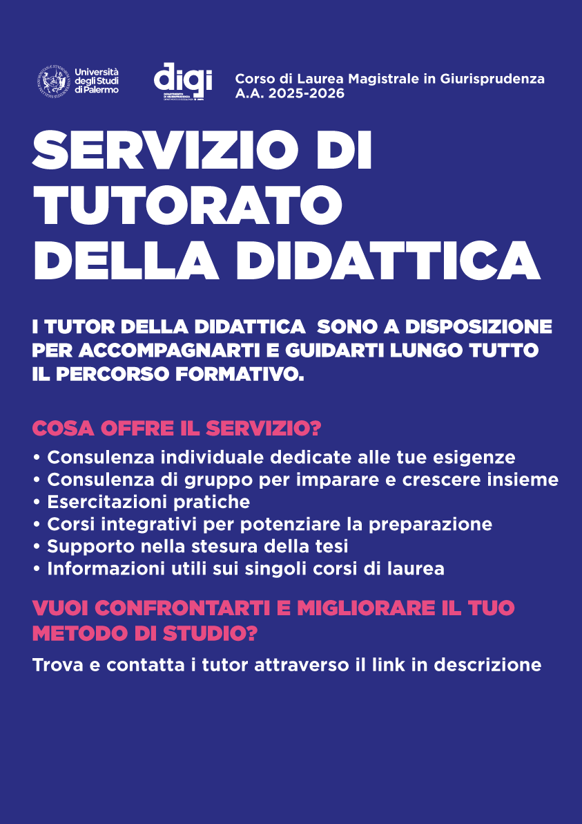 Per l’anno accademico 2025–2026 il Corso di Laurea Magistrale in Giurisprudenza attiva il Servizio di Tutorato della Didattica, rivolto alle studentesse e agli studenti del Dipartimento di Giurisprudenza dell’Università di Palermo. Il servizio nasce con l’obiettivo di accompagnare e guidare i percorsi formativi, offrendo un supporto strutturato lungo tutto l’arco degli studi.