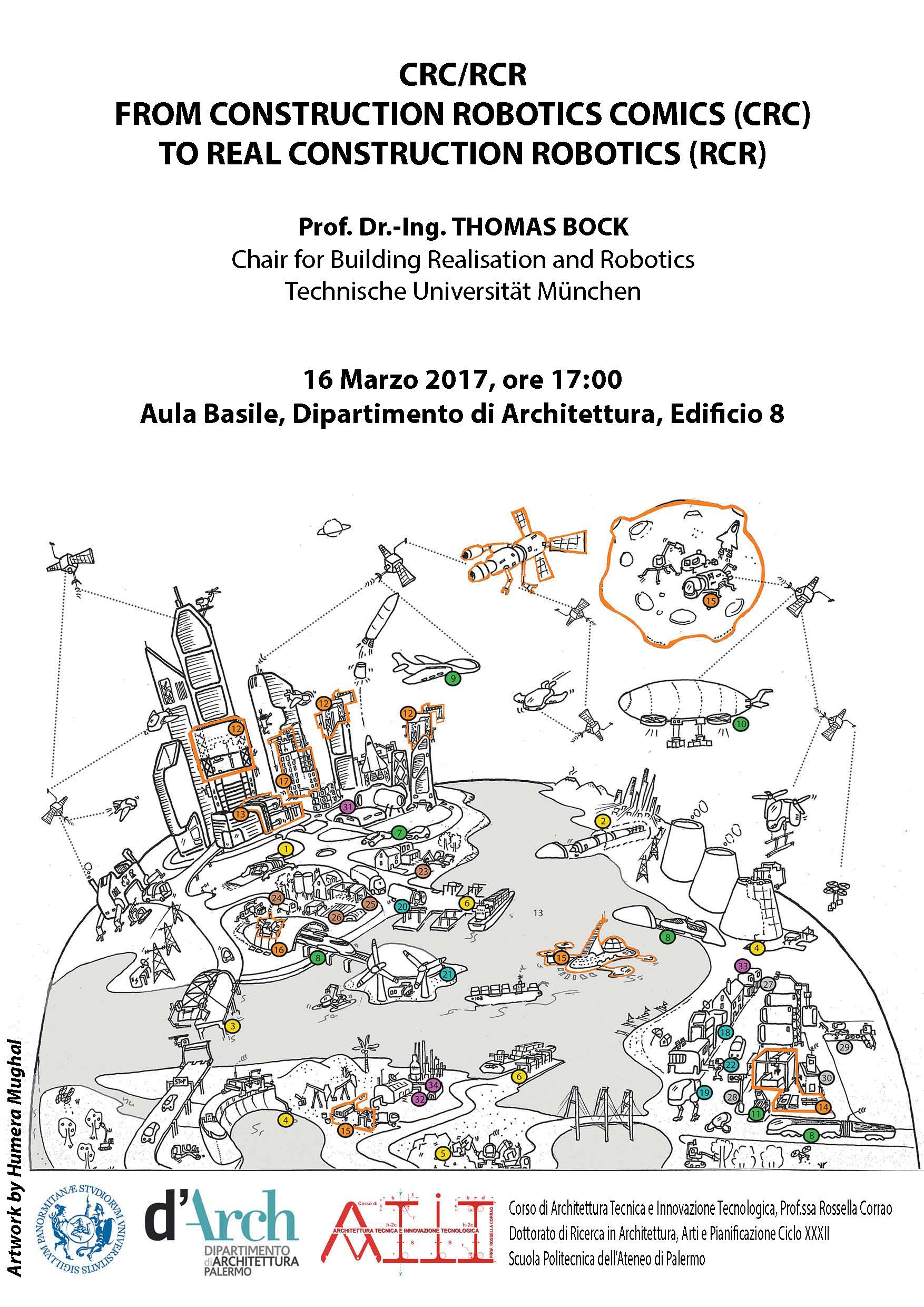 CRC/RCR from Costruction Robotics Comics to Real Costruction Robotics 13-mar-2017 Ascolta Prof. Dr.-Ing. Thomas Bock 16 marzo 2017, ore 17:00Aula Basile, Dipartimento di Architettura, edificio 8 Locandina Parole Chiave: unipa, darch, architettura, innovazione, tecnologia
