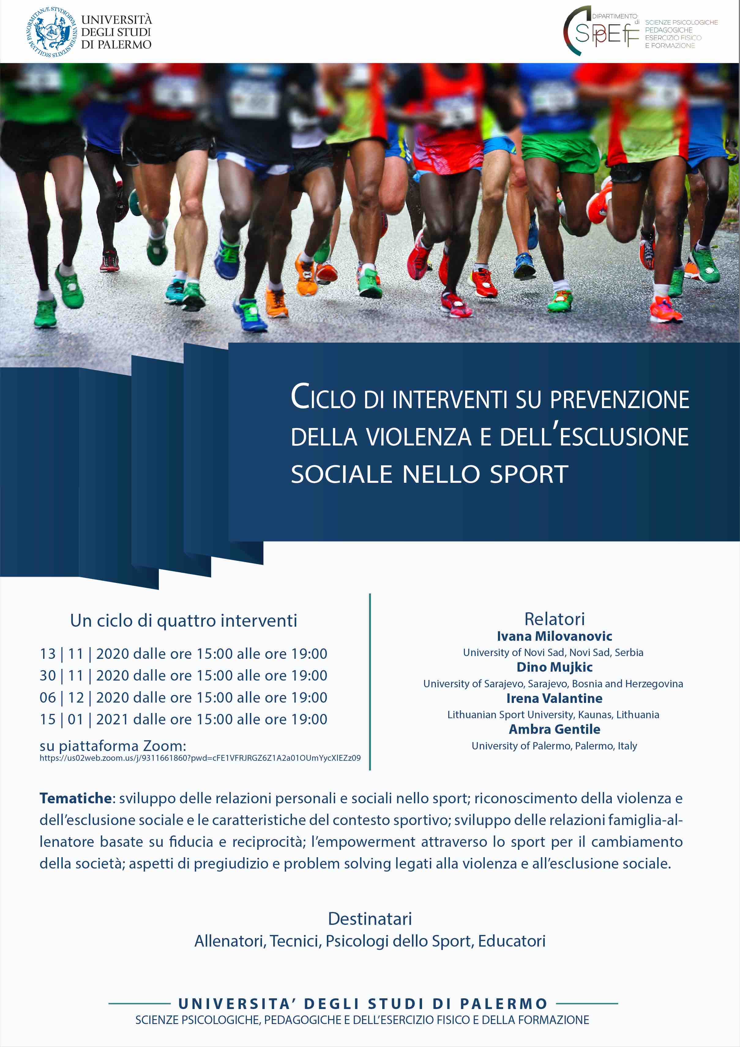 Un ciclo di quattro interventi sulla prevenzione della violenza e dell’esclusione sociale nello sport, organizzato dal Dipartimento di Scienze Psicologiche, Pedagogiche, dell’Esercizio Fisico e della Formazione nell’ambito delle attività di Terza Missione-Public Engagement, si terrà sulla piattaforma Zoom (https://us02web.zoom.us/j/9311661860?pwd=cFE1VFRJRGZ6Z1A2a01OUmYycXlEZz09) nelle seguenti giornate: