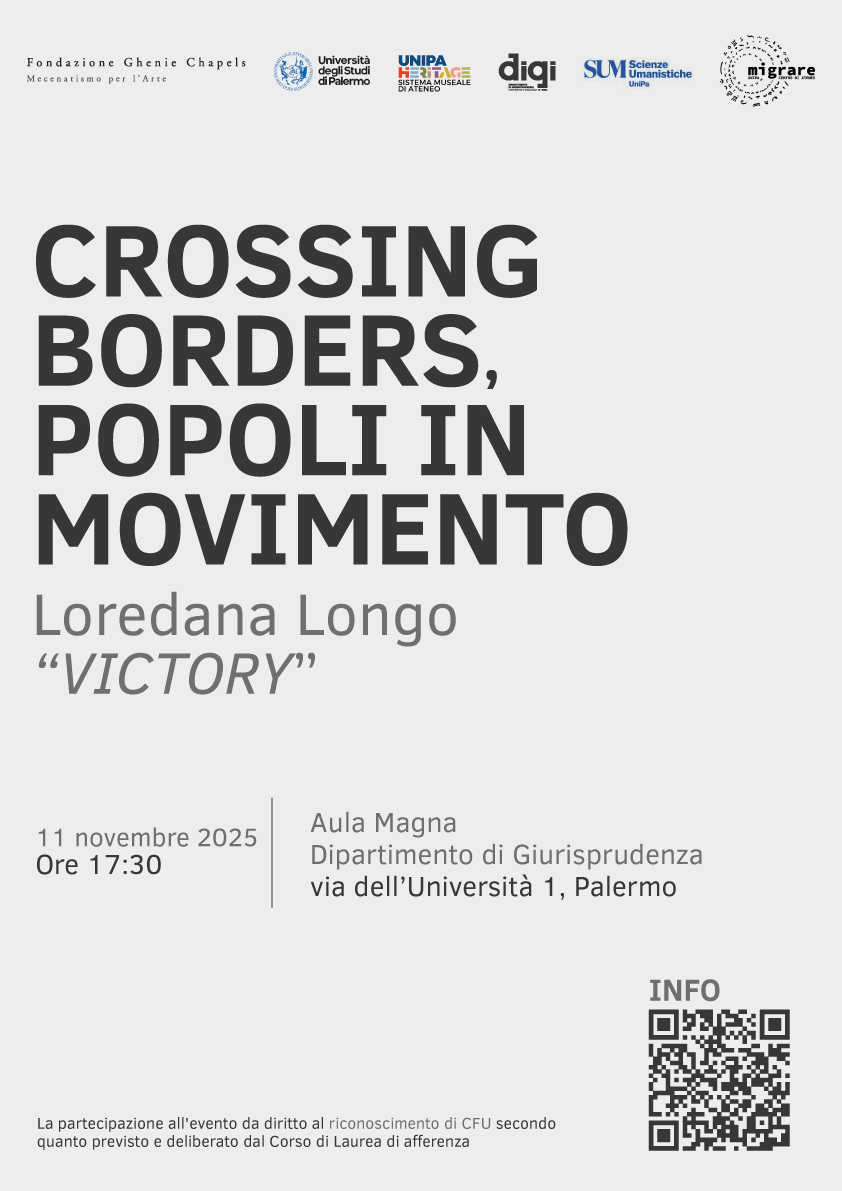 Martedì 11 novembre, alle 17.30, nell’Aula Magna del Dipartimento di Giurisprudenza - DiGi (via dell’Università, 1) si tiene un nuovo appuntamento dell’iniziativa “Crossing Borders, popoli in movimento” con la presentazione dell'opera “Victory” di Loredana Longo.
