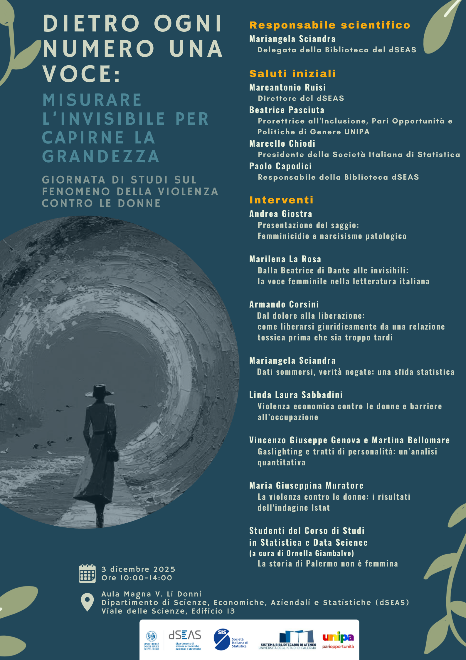 L'evento è promosso dal Dipartimento Scienze Economiche, Aziendali e Statistiche (dSEAS) dell'Università degli Studi di Palermo, in collaborazione con la Società Italiana di Statistica e con il Comitato di Ateneo per le Pari Opportunità.