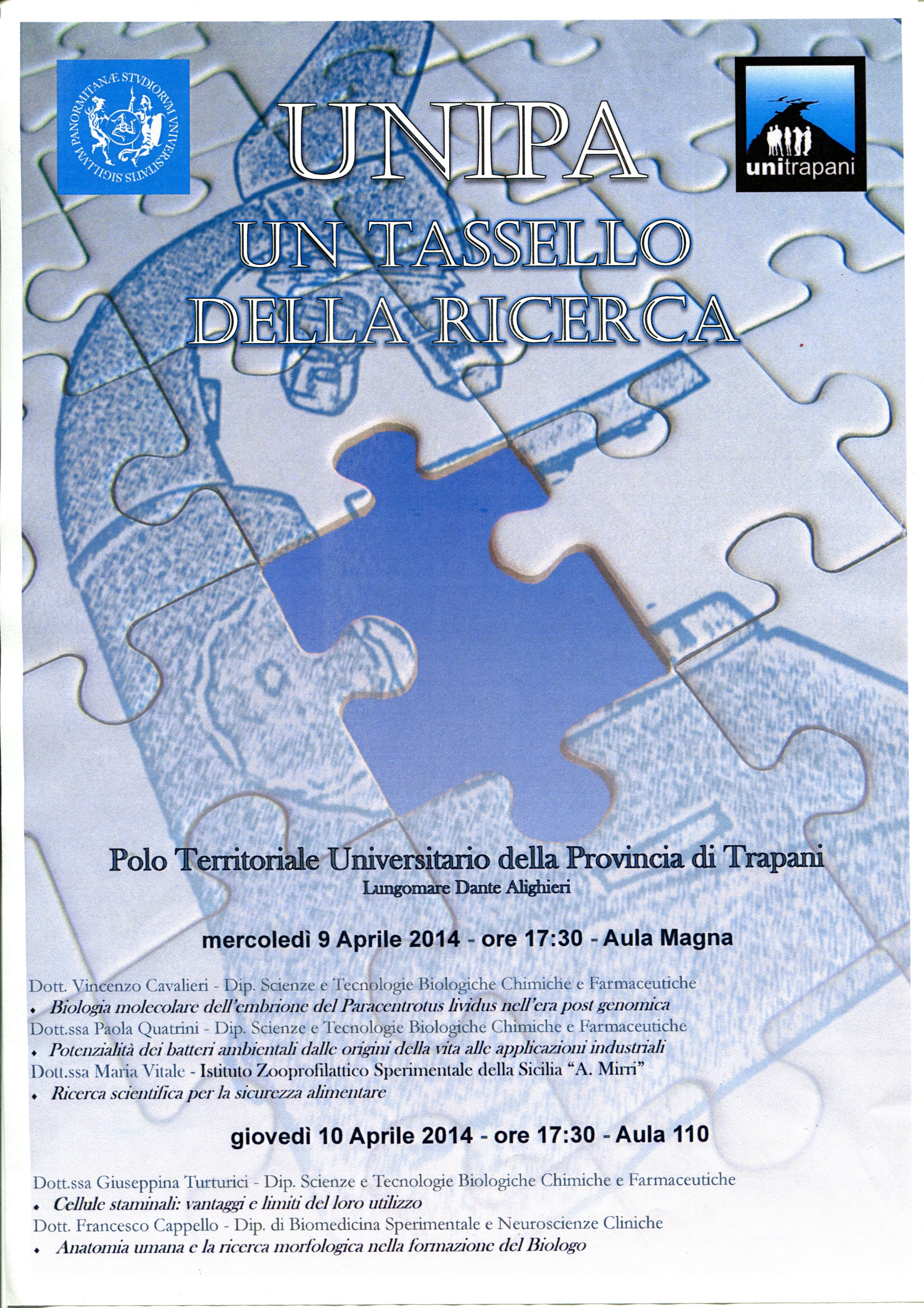 Al Polo Territoriale Universitario di Trapani, Lungomare Dante Alighieri - Erice, mercoledì 9 aprile 2014 e giovedì 10 aprile p.v., si terrà alle ore 17:30 un seminario su: "UNIPA, un tassello della ricerca".