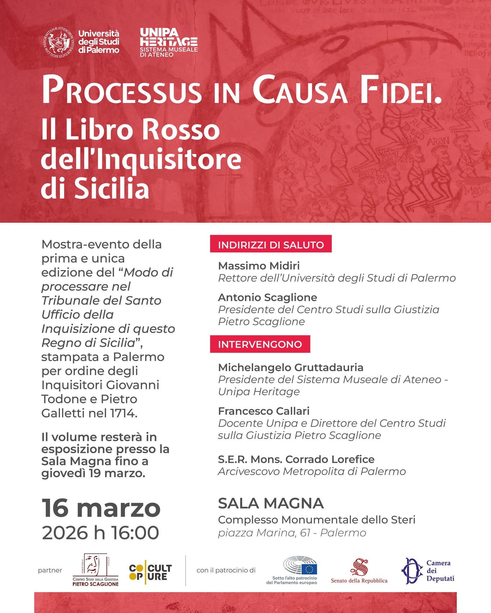 Lunedì 16 marzo 2026, alle ore 16:00, nella Sala Magna del Complesso Monumentale dello Steri, sede del Rettorato dell’Università degli Studi di Palermo, sarà inaugurata la mostra-evento “Processus in Causa Fidei. Il Libro Rosso dell’Inquisitore di Sicilia”.
