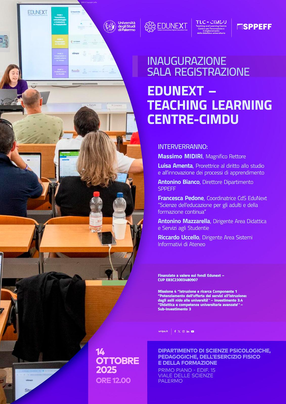 Martedì 14 ottobre 2025 alle ore 12:00, presso il primo piano dell’Edificio 15 del Campus universitario di viale delle Scienze (Dipartimento di Scienze Psicologiche, Pedagogiche, dell’Esercizio Fisico e della Formazione), si terrà l’inaugurazione della nuova “Sala regia – EduNext” per i corsi di studio telematici dell’Università degli Studi di Palermo.