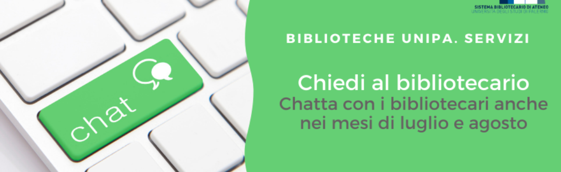 Anche nel mese di agosto è possibile chattare con i bibliotecari del servizio di reference digitale dal lunedì al venerdì dalle 9.00 alle 14.00 per richiedere informazioni su servizi e risorse delle biblioteche Unipa tramite il widget presente in tutte le pagine del portale delle biblioteche.