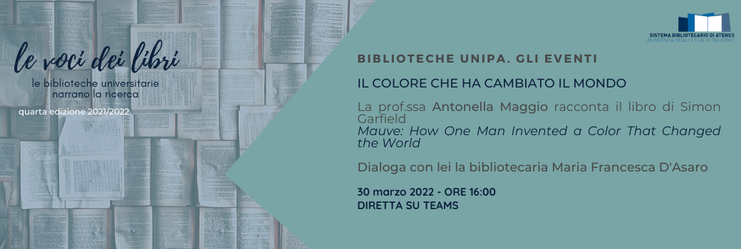 La professoressa Antonella Maggio dell'Università degli studi di Palermo, racconterà il libro Mauve: How One Man Invented a Color That Changed the World di Simon Garfield.