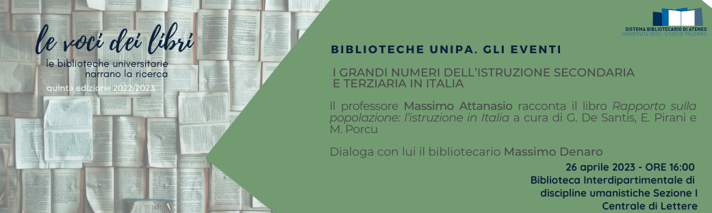 Il quinto incontro, dal titolo I grandi numeri dell’istruzione secondaria e terziaria in Italia, si svolgerà giorno 26 aprile 2023, alle ore 16:00, presso la Biblioteca Interdipartimentale di discipline umanistiche Sezione I Centrale di Lettere, Viale delle Scienze, ed. 12.
