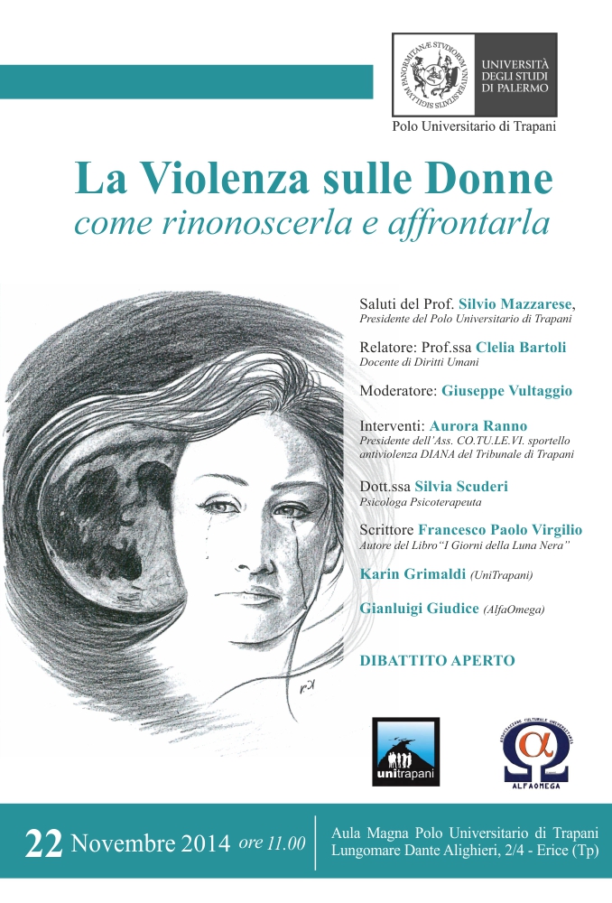 Il 22 novembre 2014, alle ore 11:00, si terrà presso l’aula magna del Polo Universitario di Trapani un incontro su: “La violenza sulle donne. Come riconoscerla e affrontarla”; i cui temi trattati verteranno appunto sulla violenza di genere e dell’estrema conseguenza quale il fenomeno del femminicidio.