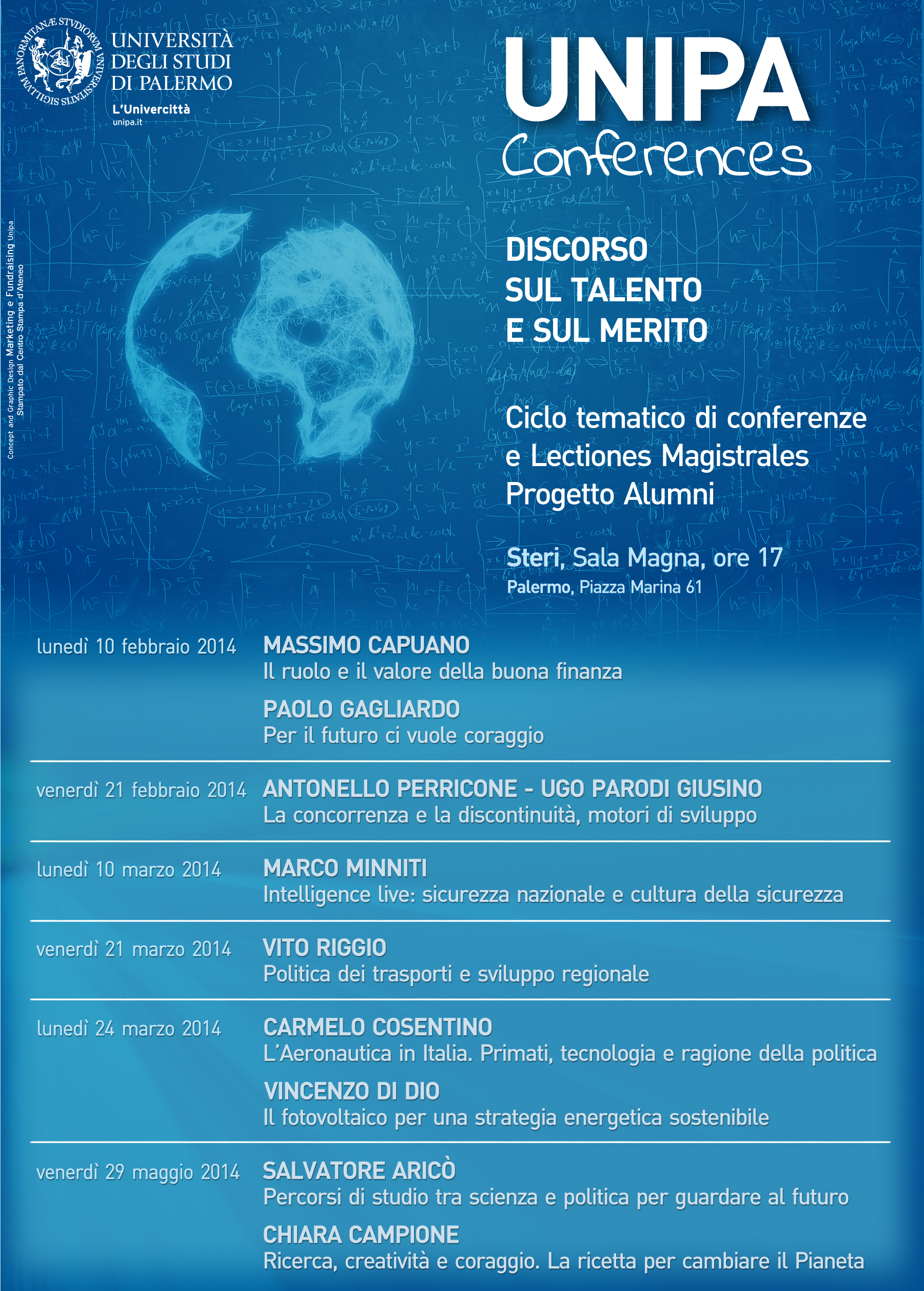 Sono laureati dell’Ateneo che si sono affermati nel mondo dell’economia, della finanza, della tecnologia, dell’ambiente, delle scienze umane. Sono i protagonisti del progetto “Alumni” dell’Università di Palermo, che porteranno agli attuali studenti le loro esperienze, le loro competenze, ma anche l’invito ad avere fiducia nelle proprie capacità e nel futuro. Il progetto, il cui responsabile scientifico è il professore Salvo Tomaselli, prosegue con due ospiti d’eccezione. Venerdì 21 febbraio 2014, alle 17, nella sala Magna dello Steri “Saliranno in cattedra” Antonello Perricone, presidente NTV e Ugo Parodi, Founder & CEO Mosaicoon. Perricone analizzerà come la concorrenza e la discontinuità siano motori di sviluppo, e per aprire la società al merito, alla trasparenza e al mercato non occorrono risorse e nuove tasse, serve invece un ‘operazione culturale necessaria per richiamare quei valori che dovrebbero fecondare i giovani sin dai primi anni di scuola. Parodi si soffermerà sulla rivoluzione digitale, dove il web è al centro delle strategie di sviluppo, e dove i limiti geografici e culturali possono costituire un volano per lo sviluppo di nuove imprese. Agli studenti che parteciperanno al ciclo di conferenze, verranno riconosciuti crediti formativi nella seguente misura: per la partecipazione a 5 conferenze, 1 CFU; per la partecipazione a 10 conferenze, 2 CFU; per la partecipazione a 15 conferenze, 3 CFU. Per il riconoscimento dei crediti formativi dovranno essere rispettate le procedure e le condizioni di cui alla citata delibera del Senato Accademico del 5 ottobre 2012, di cui si allega uno stralcio. Gli studenti e i docenti che intendono partecipare agli incontri dovranno prenotarsi attraverso il sistema accessibile dal link www.cerimoniale.unipa.it. Qui troveranno anche il calendario degli incontri del primo semestre 2014, che sarà di volta in volta aggiornato, con l’inserimento degli eventi successivi. Le prenotazioni verranno accettate fino all’esaurimento dei posti disponibili per ciascun evento.