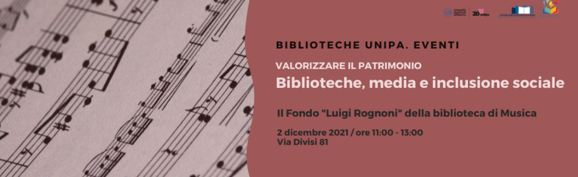 Il Sistema Bibliotecario di Ateneo dell'Università degli Studi di Palermo, al fine di valorizzare spazi, raccolte e servizi, promuove l’incontro Biblioteche, media e inclusione sociale. Il Fondo “Luigi Rognoni” della biblioteca di Musica