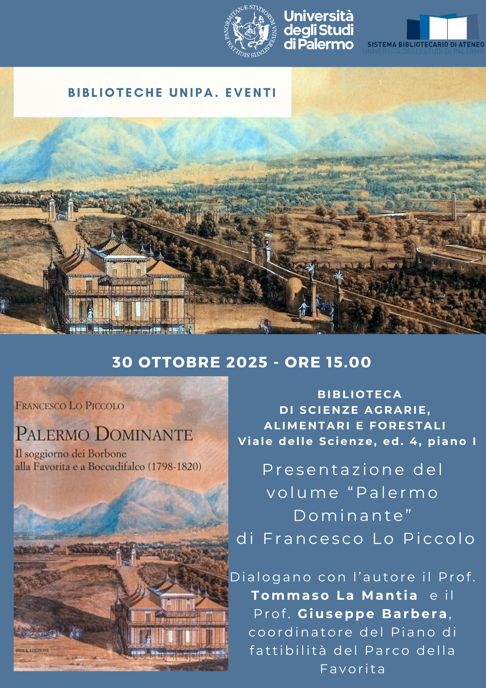 Giovedì 30 ottobre 2025, alle ore 15.00, presso la Biblioteca di Scienze Agrarie, Alimentari e Forestali, viale delle Scienze, ed. 4 ingr. A piano 1, verrà presentato il volume di Francesco Lo Piccolo dal titolo ‘Palermo dominante: il soggiorno dei Borbone alla Favorita e a Boccadifalco (1798-1820)’. Il testo ricostruisce con dovizia di particolari, frutto di ricerche d’archivio, la storia della Favorita e di Boccadifalco, le riserve volute dal re Ferdinando di Borbone, durante i quindici anni di soggiorno forzato della corte in Sicilia. Se l’aspetto architettonico-artistico della Palazzina Cinese è già stato indagato, la novità di questo volume consiste nell'indagine venatoria e botanica, nella storia delle tenute aggregate, nella ricostruzione della vita quotidiana che si conduceva alla Favorita e a Boccadifalco.