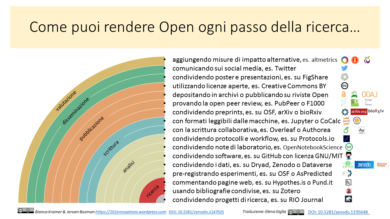 Giglia, Elena. (2018). Come rendere Open ogni passo della ricerca. Zenodo. https://doi.org/10.5281/zenodo.1195648, traduzione da Kramer, Bianca, & Bosman, Jeroen. (2018, January 14). Rainbow of open science practices. Zenodo. https://doi.org/10.5281/zenodo.1147025