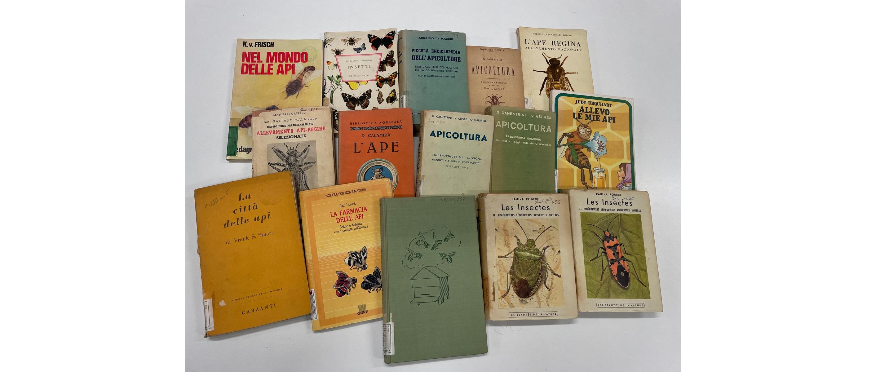 Attraverso l’esposizione di libri sulle api e l’apicoltura, appartenenti alla collezione della biblioteca, viene introdotto il tema dell’importanza di questi insetti per l’ecosistema e per la produzione di cibo.