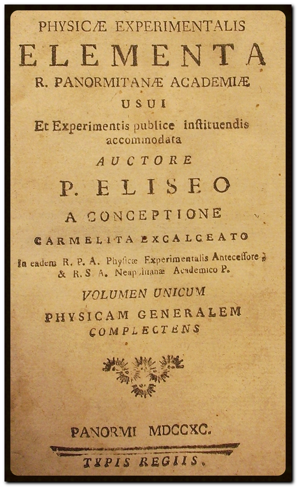 Il prof. Aurelio Agliolo Gallitto racconta il libro Physicae Experimentalis Elementa R. Panormitanae Academiae usui Et Experimentis publice instituendis accommodata [...] Panormi, Typis regiis, 1790, di padre Eliseo della Concezione