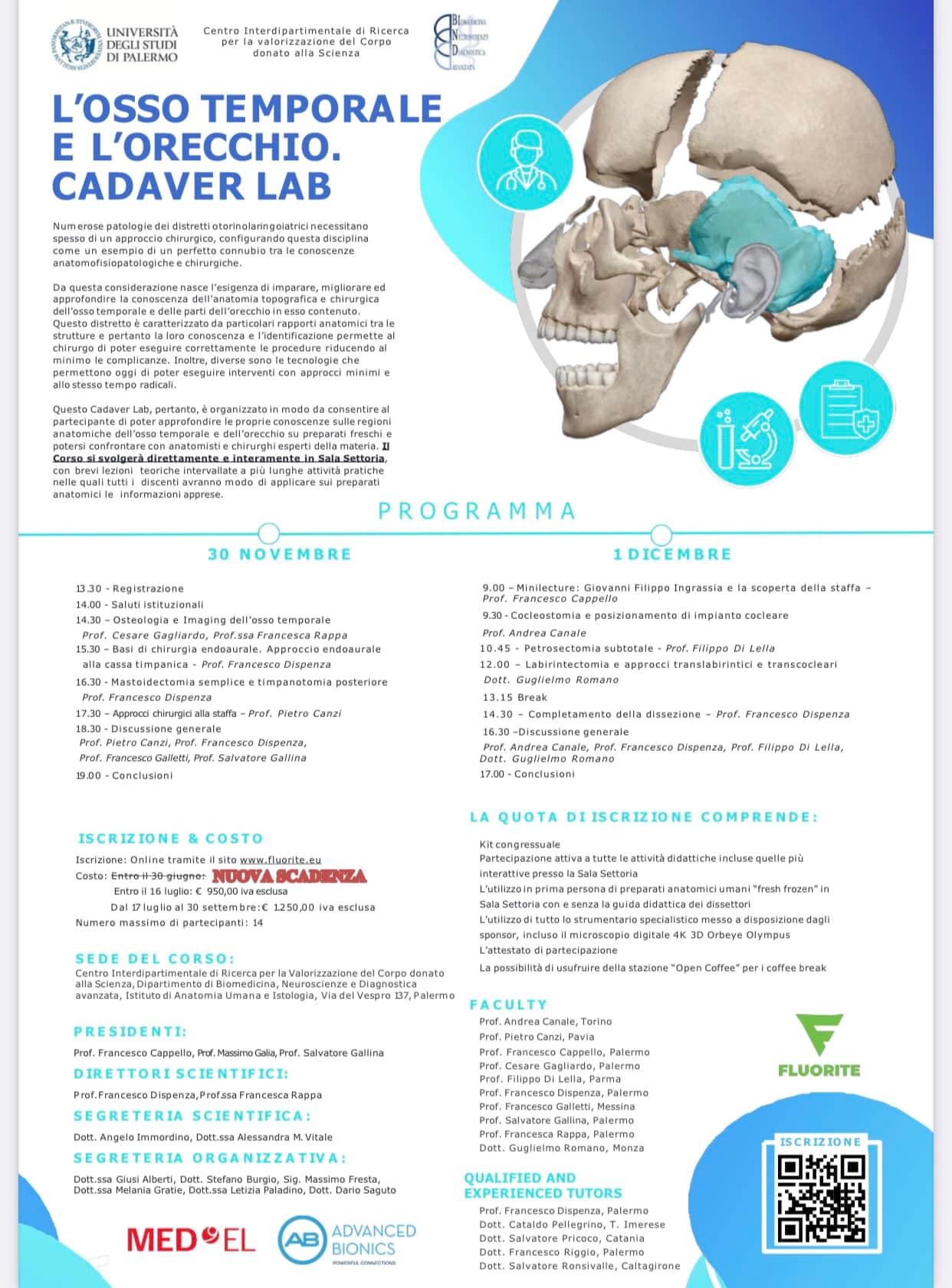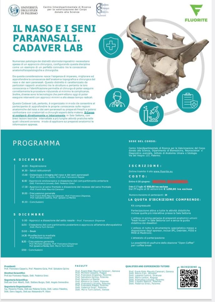 Il 30 novembre e il 1° dicembre si è svolto il Corso dal titolo “L’osso temporale e l’orecchio. CADAVER LAB” mentre il 4 e 5 dicembre si è svolto il corso dal titolo “Il naso e i seni paranasali. CADAVER LAB”. Entrambi gli eventi di alta formazione sono stati realizzati presso l’Istituto di Anatomia Umana e Istologia del Dipartimento di Biomedicina, Neuroscienze e Diagnostica avanzata dell’Università degli Studi di Palermo. Il programma dei due corsi di alta formazione ha previsto una parte teorica con lezioni frontali dedicate all’argomento specifico del corso e una più lunga parte di esercitazioni pratiche. 14 corsisti, per ciascun Cadaver Lab, hanno avuto modo di approfondire la loro conoscenza anatomica delle regioni dell’orecchio e del naso e di simulare interventi chirurgici con gli strumenti di sala operatoria sotto la guida di qualificati ed esperti tutor provenienti dalle migliori realtà ospedaliere di tutta Italia. Ancora una volta i Cadaver Lab hanno riscontrato un grande successo tra i discenti e, pertanto, tali attività formative saranno riproposte e ampliate nel 2024!