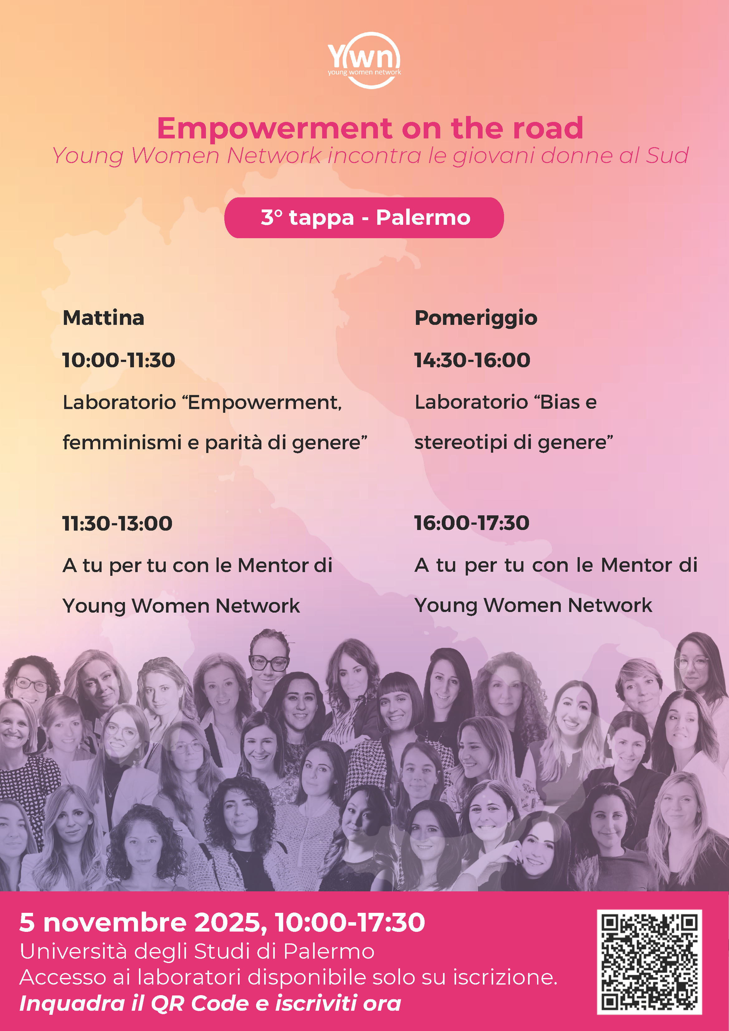 21-ott-2025 17.43.01Empowerment on the road Young Women Network incontra le giovani donne al Sud 3° tappa - Palermo Mattina Pomeriggio 14:30-16:00 10:00-11:30 Laboratorio “Bias e Laboratorio “Empowerment, stereotipi di genere” femminismi e parità di genere” 16:00-17:30 11:30-13:00 A tu per tu con le Mentor di A tu per tu con le Mentor di Young Women Network Young Women Network 5 novembre 2025, 10:00-17:30 ... Code e iscriviti ora Locandina Empowerment on the road- DEFINITIVE DAGzsPy_wSI,BAD8-VvMuss,0 Rosy