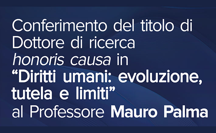 17-feb-2026 13.44.53Conferimento del titolo di Dottore di ricerca honoris causa in "Diritti umani: evoluzione, tutela e limiti" al prof. Mauro Palma articolo, notizia, unipa Venerdì 20 febbraio, alle 10.00, nella Sala Magna del Complesso Monumentale dello Steri (piazza Marina, 61) si tiene la cerimonia ... e limiti" al prof. Mauro Palma. Programma Saluti Massimo Midiri, Rettore Antonella Sciortino ... di ricerca honoris causa Lectio Magistralis "Parole che tradiscono" Mauro Palma Ingresso