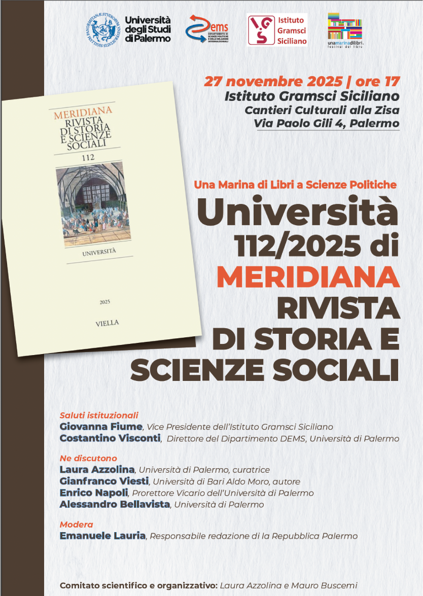 24-nov-2025 9.32.45Università 112/2025 di MERIDIANA: "RIVISTA DI STORIA E SCIENZE SOCIALI" - 27 novembre articolo, notizia, unipa MERIDIANA: “ RIVISTA DI STORIA E SCIENZE SOCIALI” 27 Novembre 2025 - IstitutoGramsci Siciliano -Cantieri Culturali alla Zisa Visualizza locandina LOREDANA LA ROSA
