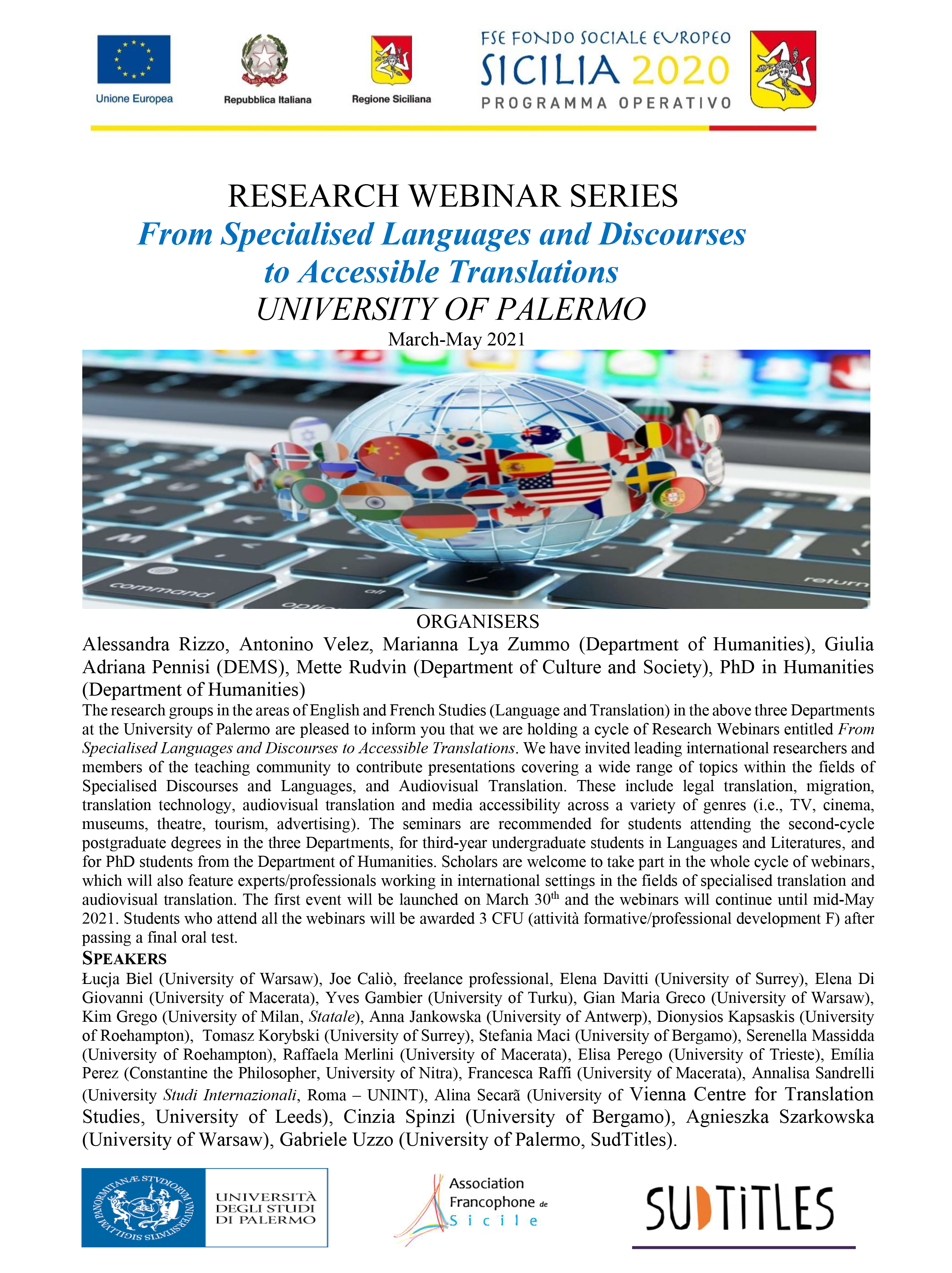 8-ago-2025 8.26.00RESEARCH WEBINAR SERIES From Specialised Languages and Discourses to Accessible Translations UNIVERSITY OF PALERMO March-May 2021 Research webinar, Unipa, Sum, Research seminars BIAGIA RUSSO Research seminars /sites/portale/_categories/notizia/bacheca/ /sites/portale/_categories/notizia/primo_piano/