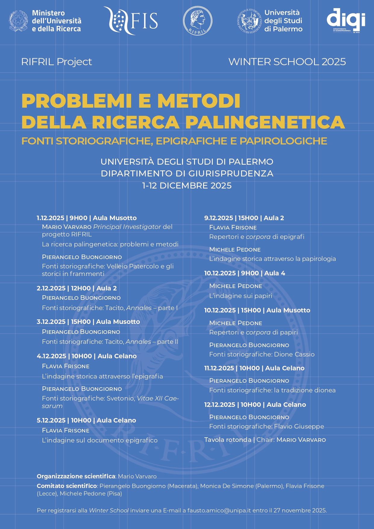 28-nov-2025 17.24.48RIFRIL Project WINTER SCHOOL 2025 PROBLEMI E METODI DELLA RICERCA PALINGENETICA FONTI STORIOGRAFICHE, EPIGRAFICHE E PAPIROLOGICHE UNIVERSITÀ DEGLI STUDI DI PALERMO DIPARTIMENTO DI GIURISPRUDENZA 1-12 DICEMBRE 2025 1.12.2025 | 9H00 | Aula Musotto 9.12.2025 | 15H00 | Aula 2 Mario Varvaro Principal Investigator del Flavia Frisone progetto RIFRIL Repertori e corpora di epigrafi La ricerca palingenetica: problemi e metodi Michele Pedone Pierangelo Buongiorno L’indagine storica attraverso