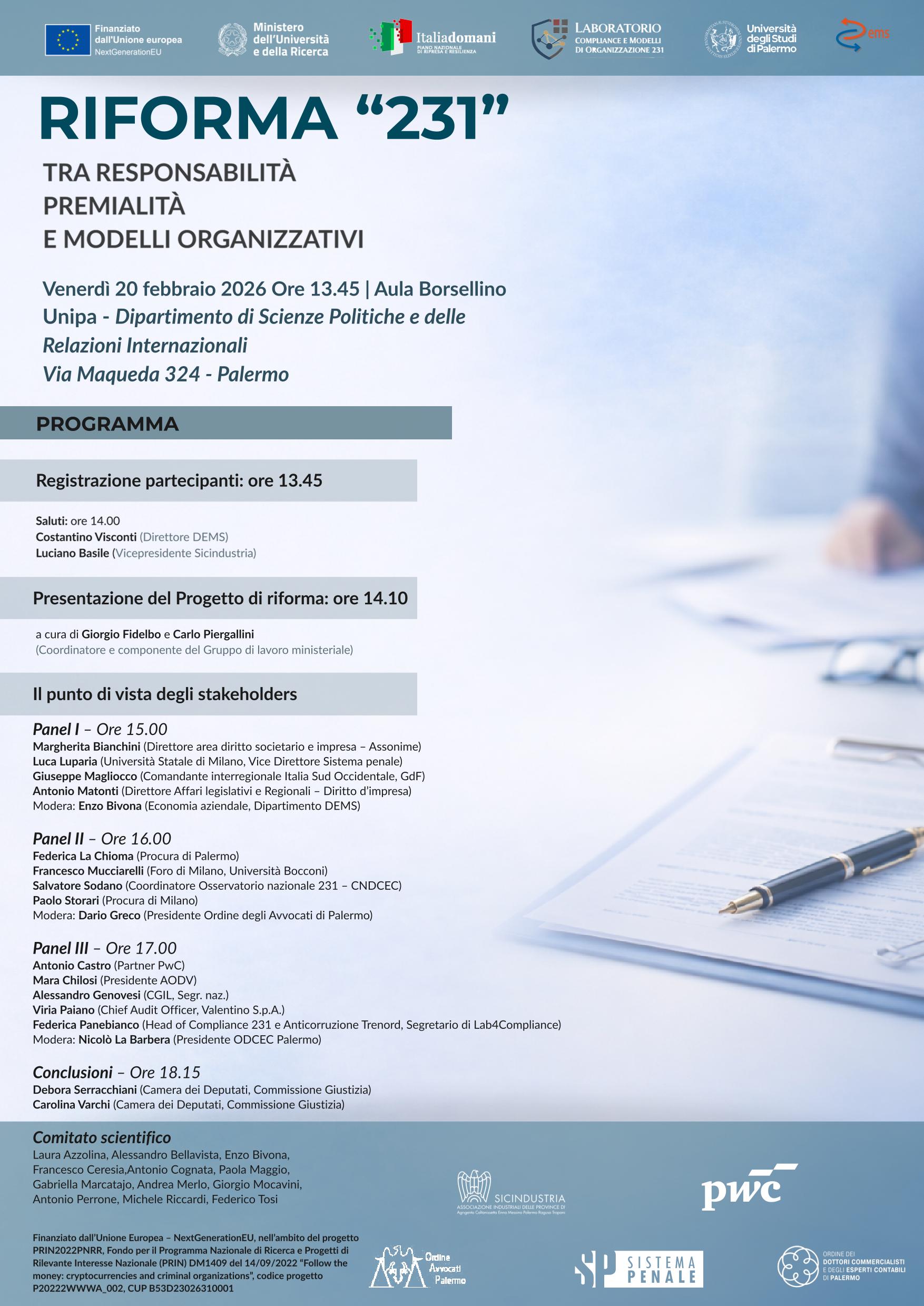 18-feb-2026 12.58.00RIFORMA “231” TRA RESPONSABILITÀ PREMIALITÀ E MODELLI ORGANIZZATIVI Venerdज 20 febbraio 2026 Ore 13.45 Ň Aula Borsellino Unipa Ŋ irautimento 7i "ciene Politic_e e 7elle !elaioni Inteunaionali ( ia atue7a ƐƏƑ ň Paleumo ¨ ROJ RAMMA Registrazione partecipanti: ore 13.45 Saluti: ore 14.00 Costantino Visconti (Direttore DEMS) Luciano Basile (Vicepresidente Sicindustria) Presentazione ... criminal organizations”, codice progetto P20222WWWA_002, CUP B53D23026310001 Riforma 231