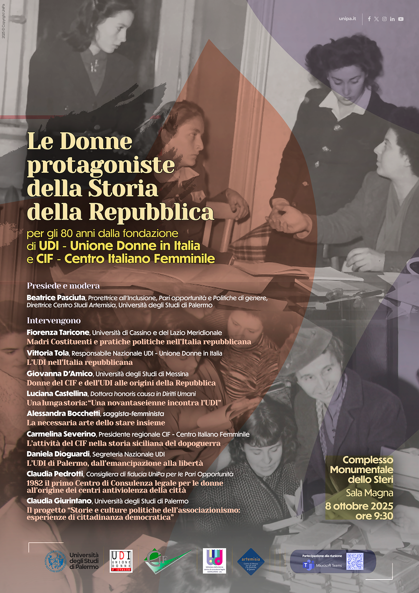6-ott-2025 10.58.44protagoniste della storia della Repubblica. Per gli 80 anni dalla fondazione di UDI - Unione Donne ... Sala Magna, Steri - piazza Marina, 61 | Online articolo, notizia, unipa, donne, storia della repubblica, UDI, CIF, pari opportunità, artemisia Mercoledì 8 ottobre, alle 9.30, nella Sala Magna ... : esperienza di cittadinanza democratica" Visualizza la locandina Le donne protagoniste della storia della Repubblica. Per gli 80 anni dalla fondazione di UDI e CIF FEDERICA PULEO /sites/portale