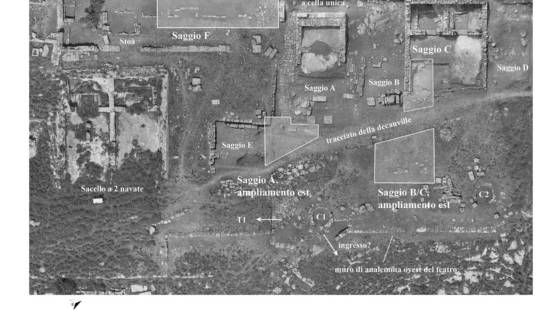 Le indagini hanno permesso di riconoscere varie fasi di frequentazione e monumentalizzazione dell’area. Al IV secolo a.C. possono riferirsi i resti di strutture murarie e di alcuni altari con orientamento diverso dai monumenti successivi. Al III secolo è ascrivibile la stoà e il muro di sostegno della plateia che borda a monte il complesso (Via degli artigiani), mentre i templi, pur realizzati in momenti diversi, sembrano databili nel II-I secolo a.C. Gli scavi dello scorso anno hanno inoltre evidenziato un lungo muro di analemma rettilineo che delimita ad Ovest la cavea del teatro e sostiene la terrazza immediatamente inferiore al tempio a doppia cella, al quale l’edificio teatrale sembra essere legato.