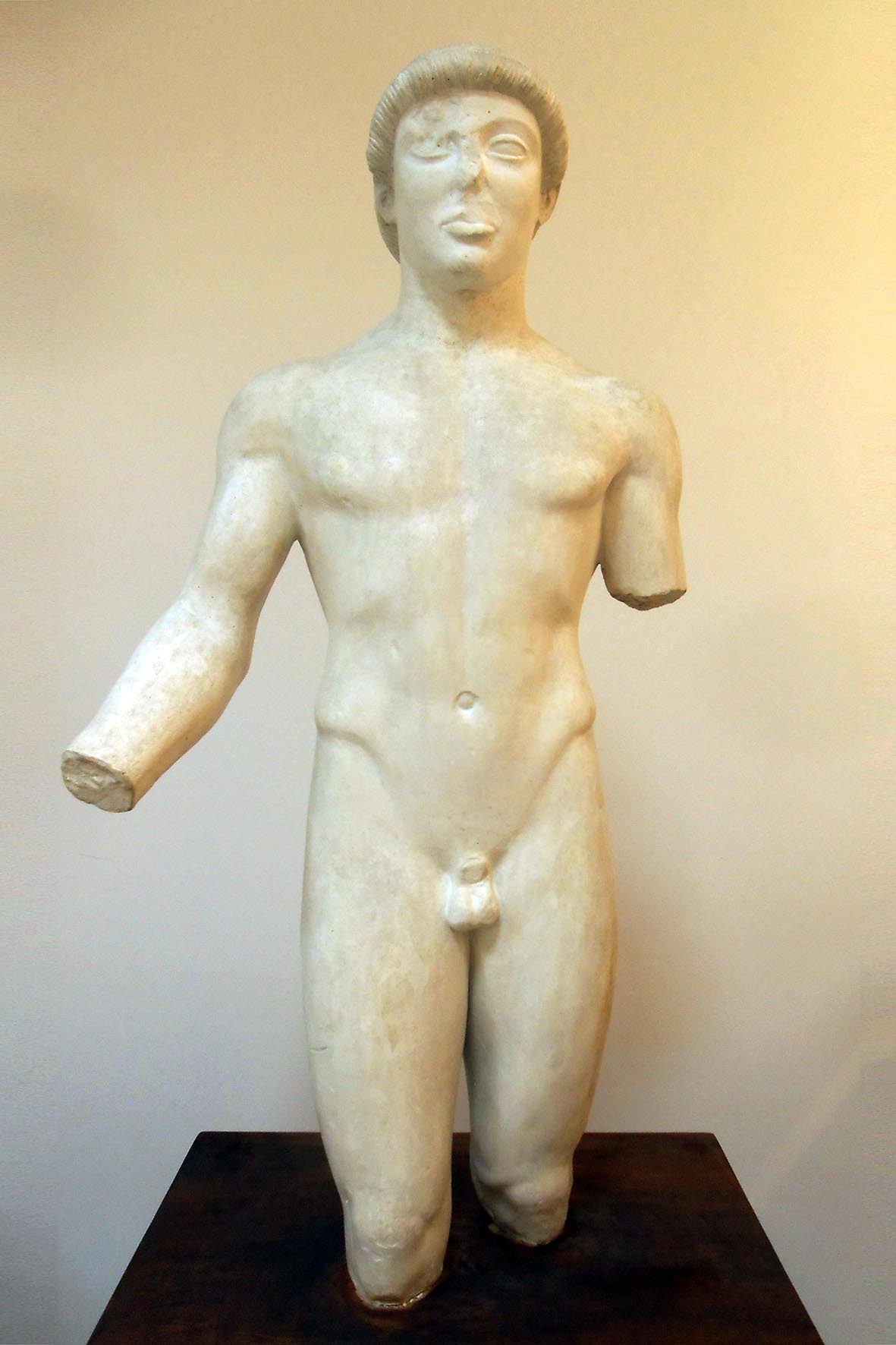 Tradizionalmente designato come “Efebo di Agrigento”, il piccolo kouros in marmo insulare, ritrovato intorno al 1880, non tiene entrambe le braccia distese lungo i fianchi, secondo l’iconografia consueta per questo genere di sculture, ma tende in avanti il braccio destro, scostandolo dal corpo, nell’atto di recare un oggetto (offerta o attributo) nella mano ora perduta. Tale gesto ha ispirato l’ipotesi che la figura rappresenti il fiume Akragas, sulla base di confronti con le personificazioni dei fiumi locali che compaiono nella monetazione selinuntina, ma, in realtà, per l’interpretazione del kouros non si può evitare di fare riferimento alla produzione attica tardoarcaica e alle sue più aggiornate conquiste formali. Certo databile al 480 a.C. circa, appunto sulla base di taluni dettagli che rimandano al periodo iniziale del cosiddetto Stile severo (480-450 a.C.), come l’impostazione generale e il trattamento delle superfici muscolari, la statua di Agrigento manifesta tuttavia una rigidità nella postura che, negli esiti più significativi della scultura attica coeva, appare meglio superata (ad esempio nel c.d. Efebo di Crizio, più volte richiamato a riscontro).