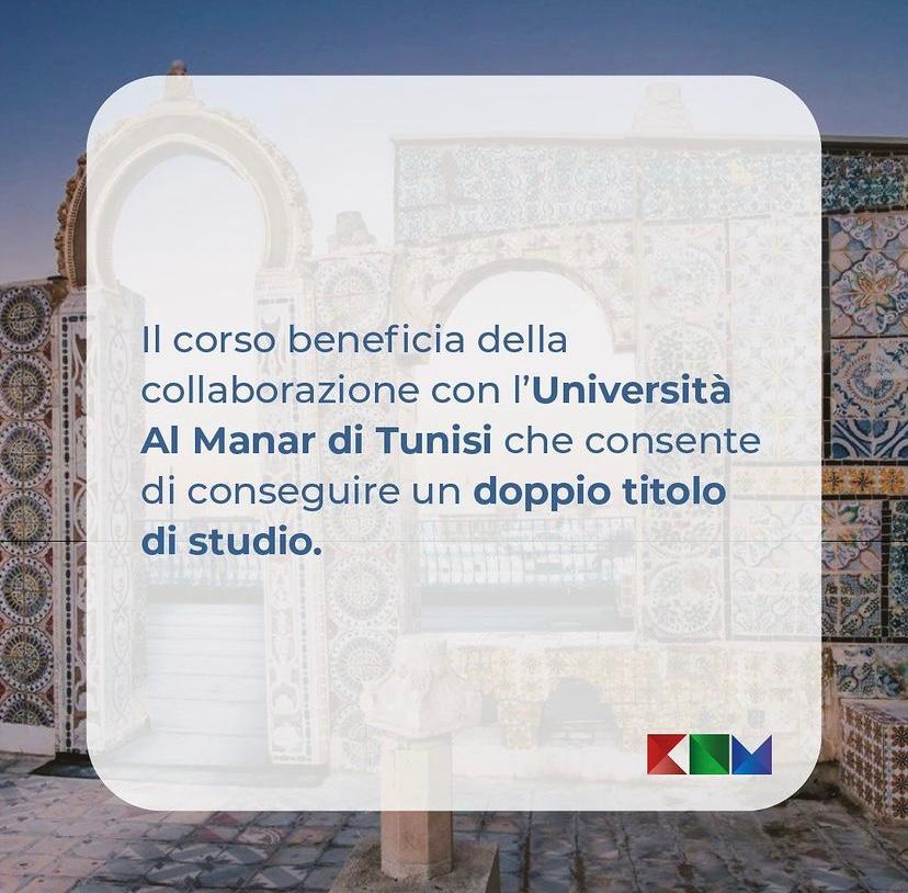 Il Corso ha una vocazione internazionale e beneficia della collaborazione con l’Università Al Manar di Tunisi che consente, a coloro che lo desiderino e dopo un periodo di permanenza in Tunisia, di conseguire un titolo di studio che ha valore legale sia in Italia sia in Tunisia.