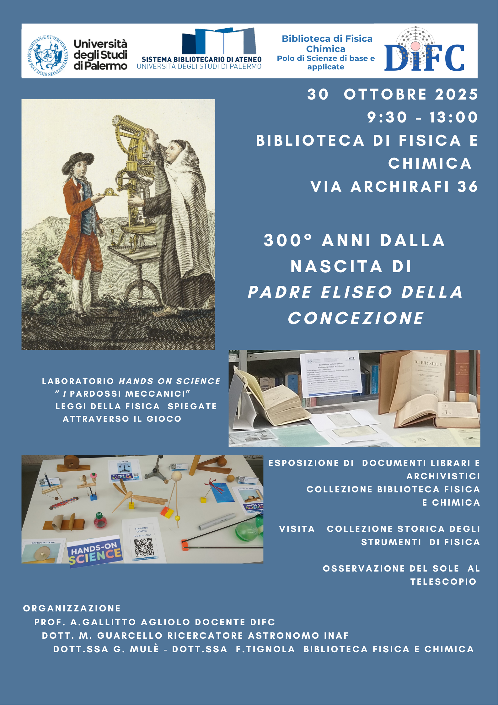 La Biblioteca di Fisica e Chimica giovedì 30 ottobre 2025 dalle ore 9,30 alle 12.00 ospita presso la sala lettura di via Archirafi una mostra ed un laboratorio didattico in occasione del 300° anniversario della nascita di Padre Eliseo della Concezione docente di Fisica Sperimentale presso la Regia Accademia degli Studi di Palermo dal 1780 al 1811.