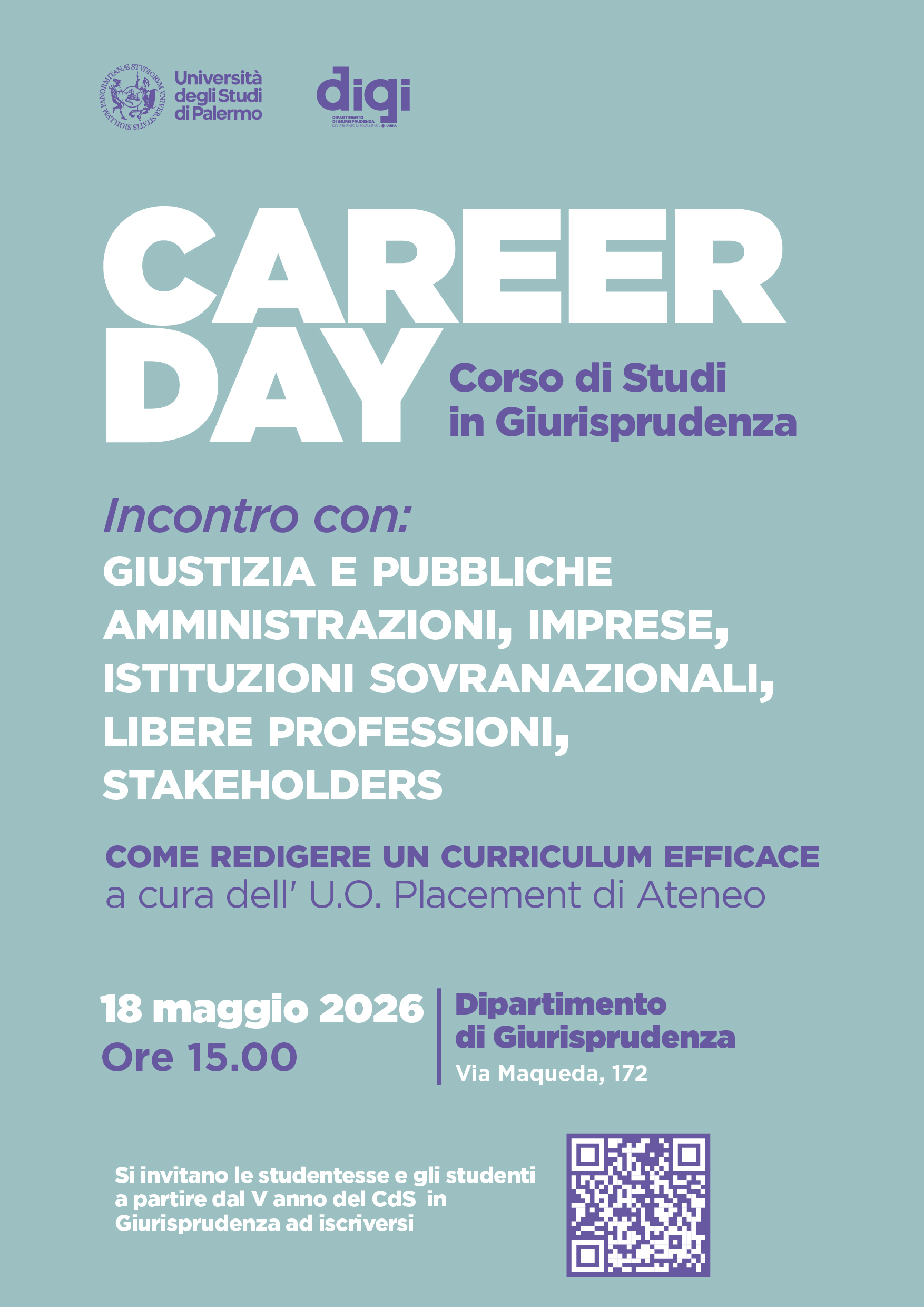 Lunedì 18 maggio 2026, alle ore 15.00, presso il Dipartimento di Giurisprudenza dell’Università degli Studi di Palermo, in via Maqueda 172, si terrà il Career Day del corso di studi in Giurisprudenza, promosso come occasione di orientamento e approfondimento sui principali sbocchi professionali connessi alla formazione giuridica negli ambiti della giustizia, delle pubbliche amministrazioni, delle imprese, delle istituzioni sovranazionali e delle libere professioni.