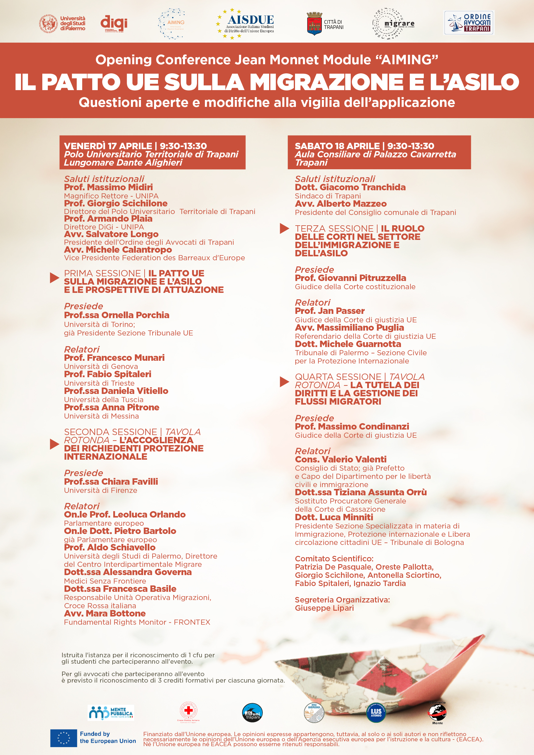 Il Dipartimento di Giurisprudenza dell’Università degli Studi di Palermo promuove, il 17 e 18 aprile a Trapani, la conferenza di apertura del Jean Monnet Module "AIMING", intitolata "Il patto UE sulla migrazione e l’asilo. Questioni aperte e modifiche alla vigilia dell’applicazione", dedicata a un passaggio decisivo per il diritto dell’Unione europea e alle trasformazioni introdotte dal nuovo assetto in materia di migrazione e asilo.