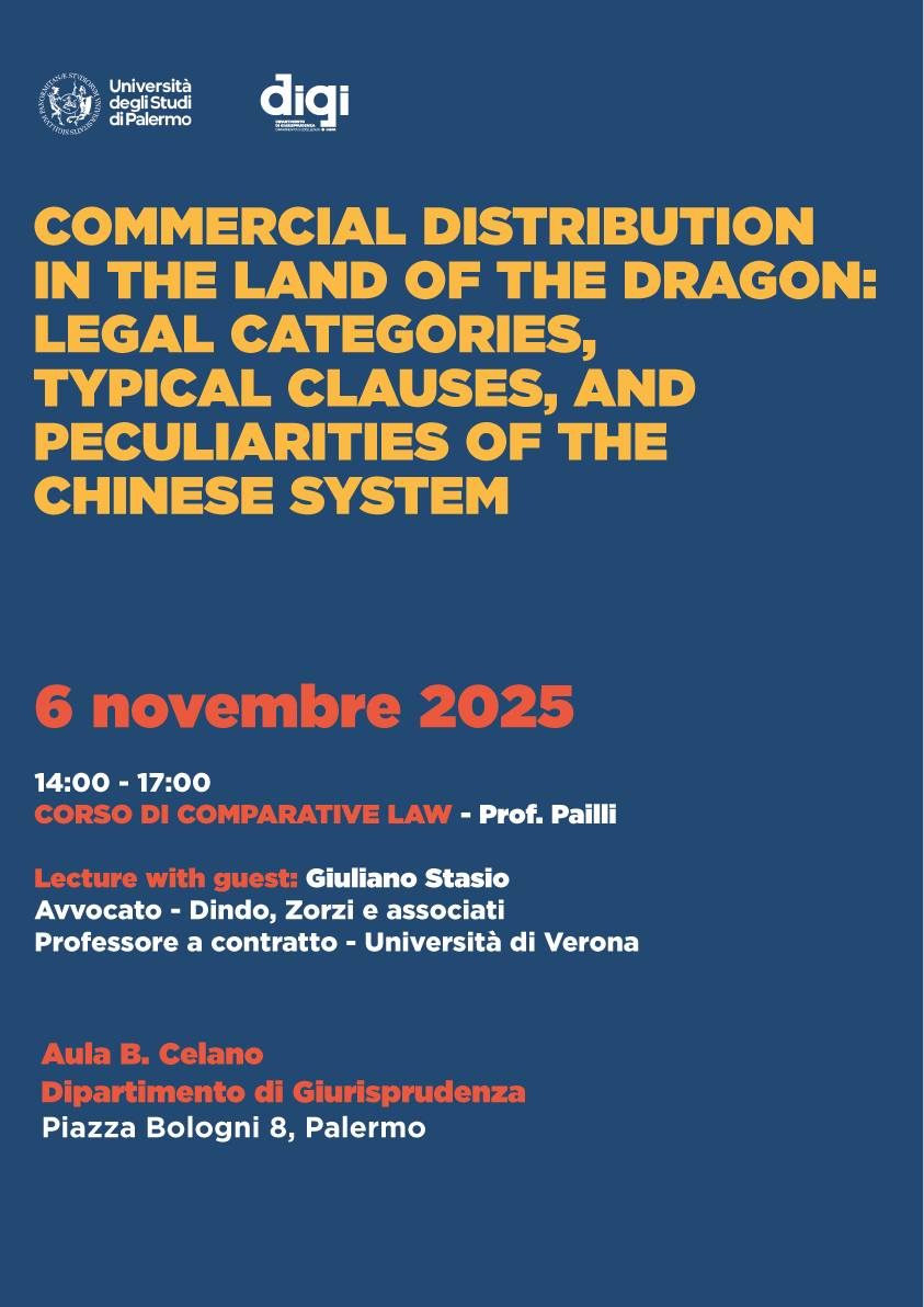 Il 6 novembre 2025, alle ore 14:00 (Aula B. Celano) il Dipartimento di Giurisprudenza, ospita la Lecture “Commercial Distribution in the Land of the Dragon. Legal categories, typical clauses, and peculiarities of the Chinese system” con Giuliano Stasio (Avvocato, Dindo Zorzi e Associati; Professore a contratto, Università di Verona), nell’ambito del corso di Comparative Law (Prof. Pailli). Un’analisi delle categorie giuridiche e delle clausole tipiche della distribuzione commerciale in Cina, con attenzione alle divergenze rispetto ai modelli europei e alle implicazioni di drafting.