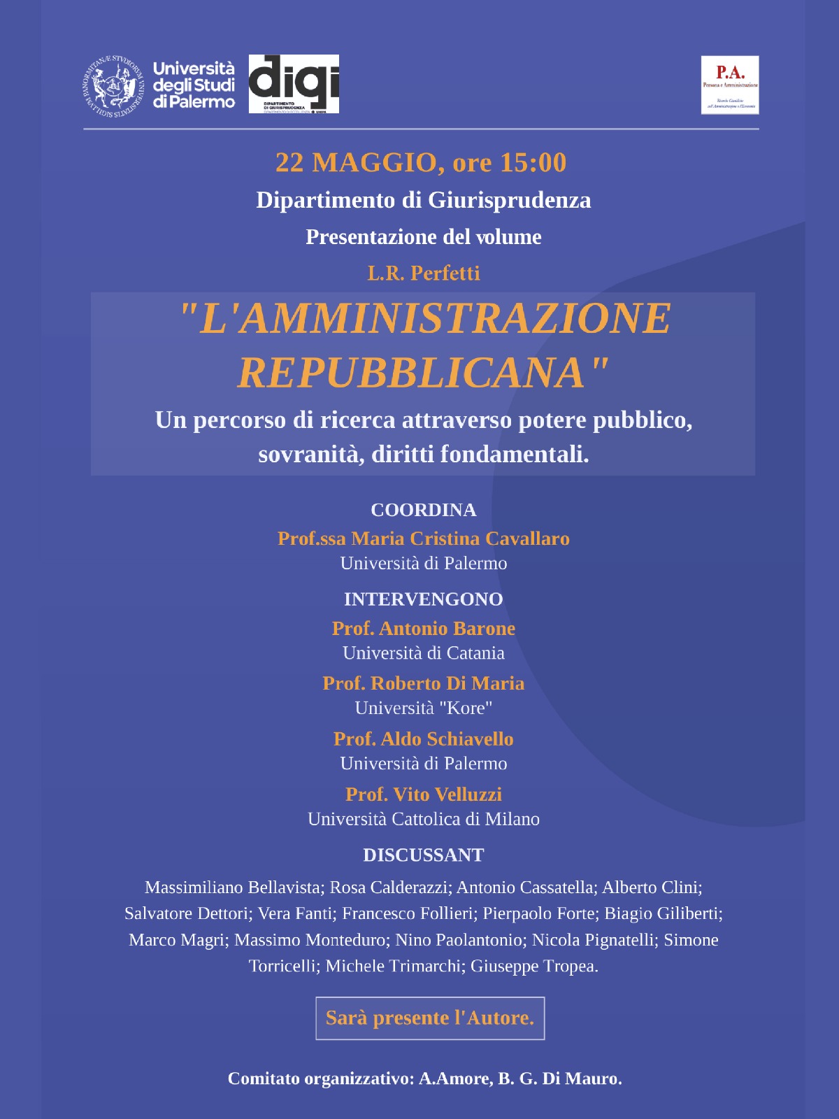 Giovedì 22 maggio alle 15.00, al Dipartimento di Giurisprudenza dell’Università degli Studi di Palermo, sarà presentato il volume di L.R. Perfetti, "L’amministrazione repubblicana". L’incontro mette al centro un itinerario di ricerca che attraversa potere pubblico, sovranità e diritti fondamentali, aprendo una riflessione su alcuni nodi cruciali del diritto pubblico contemporaneo.Coordina la Prof.ssa Maria Cristina Cavallaro. Sarà presente l’autore.