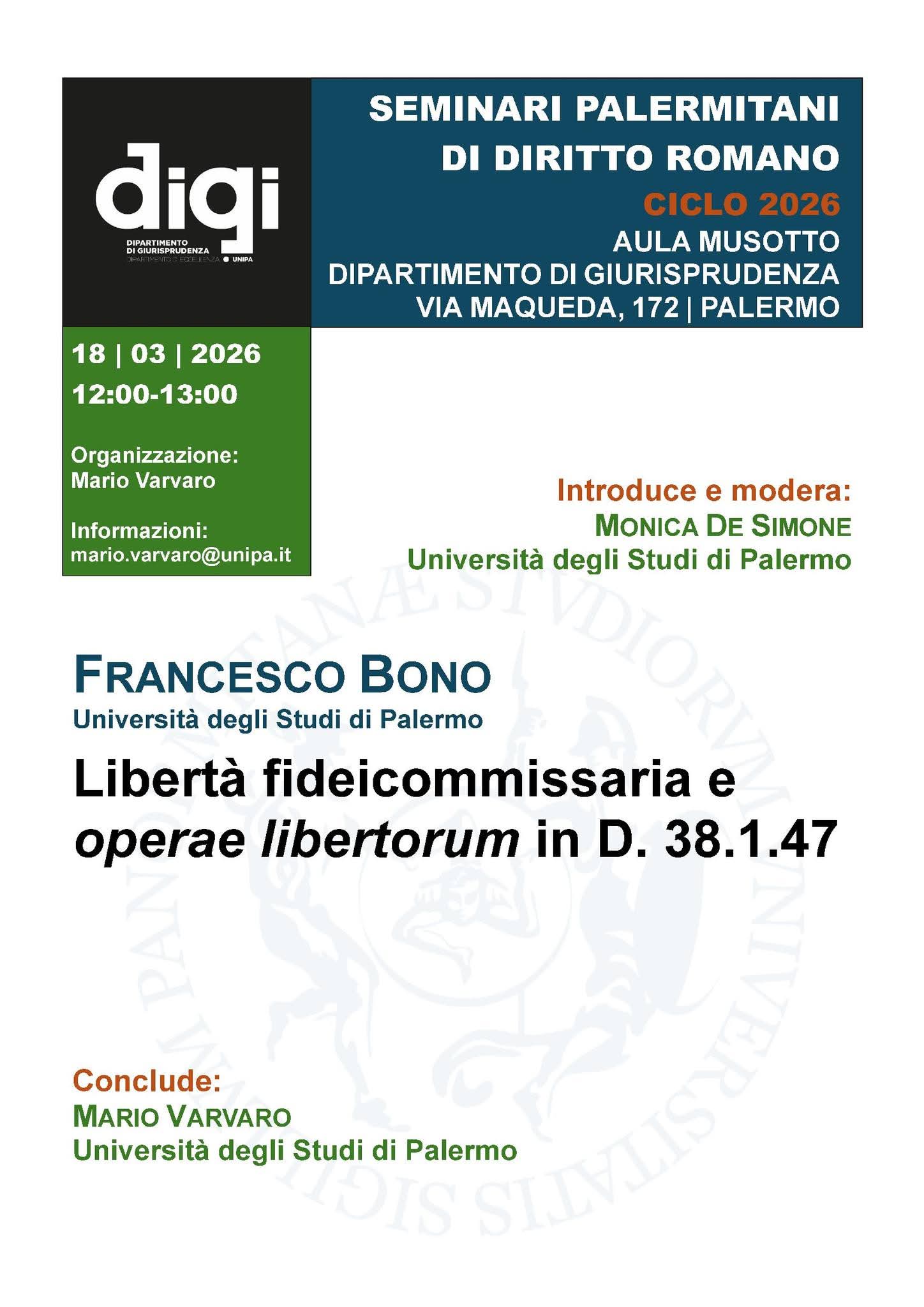 A intervenire sarà Francesco Bono (Università degli Studi di Palermo) con una relazione dal titolo «Libertà fideicommissaria e operae libertorum in D. 38.1.47».