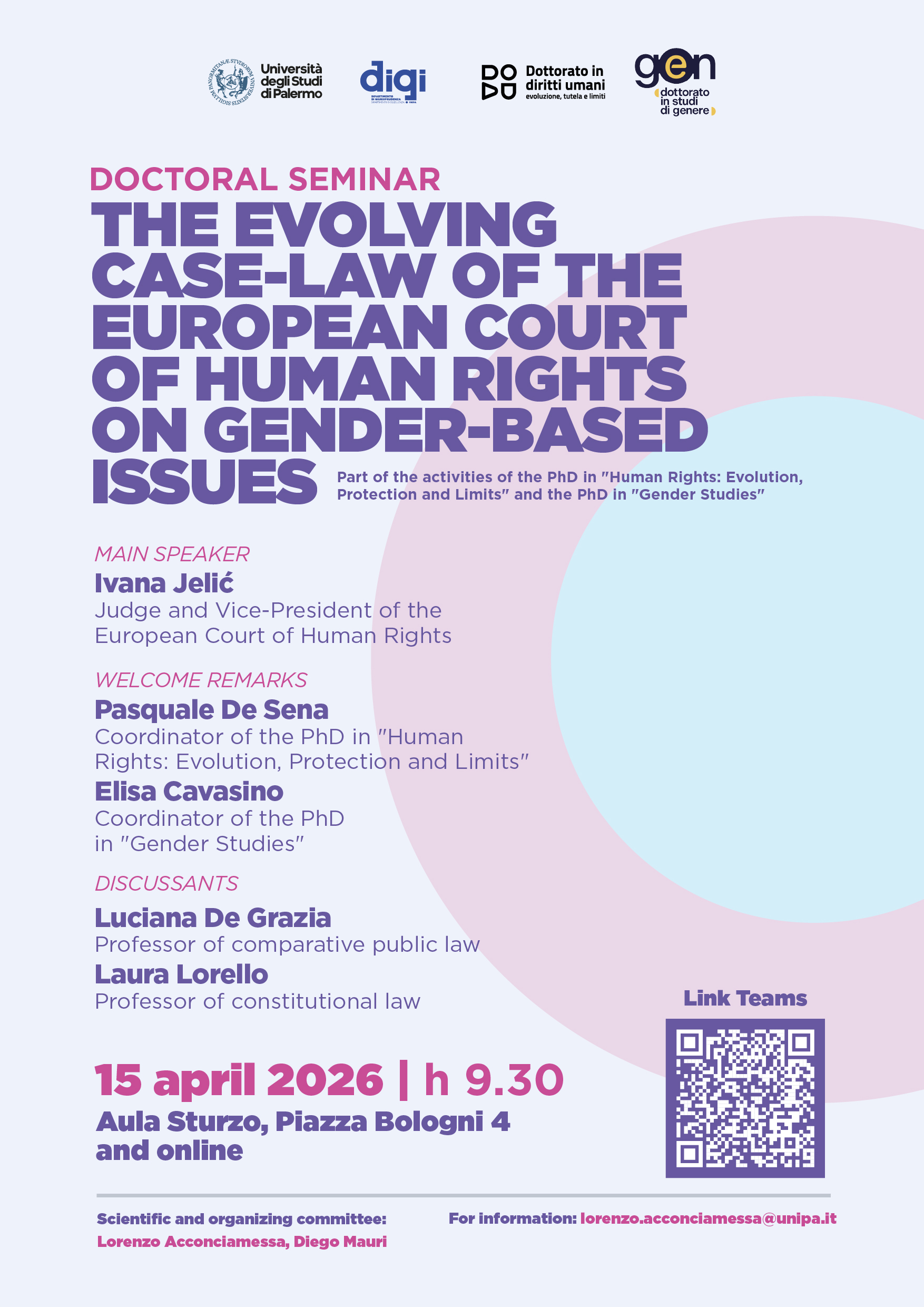 Mercoledì 15 aprile 2026, alle 9.30, nell’Aula Sturzo di Piazza Bologni 4 si terrà il doctoral seminar “The evolving case-law of the European Court of human rights on gender-based issues", promosso nell’ambito delle attività del dottorato in “Diritti umani: evoluzione, tutela e limiti” e del dottorato in “Studi di genere” dell’Università degli Studi di Palermo. La relazione principale sarà svolta da Ivana Jelić, giudice e vicepresidente della Corte europea dei diritti dell’uomo. I saluti introduttivi saranno affidati al prof. Pasquale De Sena, coordinatore del dottorato in “Diritti umani: evoluzione, tutela e limiti”, e alla prof.ssa Elisa Cavasino, coordinatrice del dottorato in “Studi di genere”. Interverranno come discussants la prof.ssa Luciana De Grazia e la prof.ssa Laura Lorello. Il seminario potrà essere seguito anche da remoto tramite Microsoft Teams: https://teams.microsoft.com/meet/37647334688935?p=ZFBQv6nwZQMzvUuipu. Per informazioni: lorenzo.acconciamessa@unipa.it.