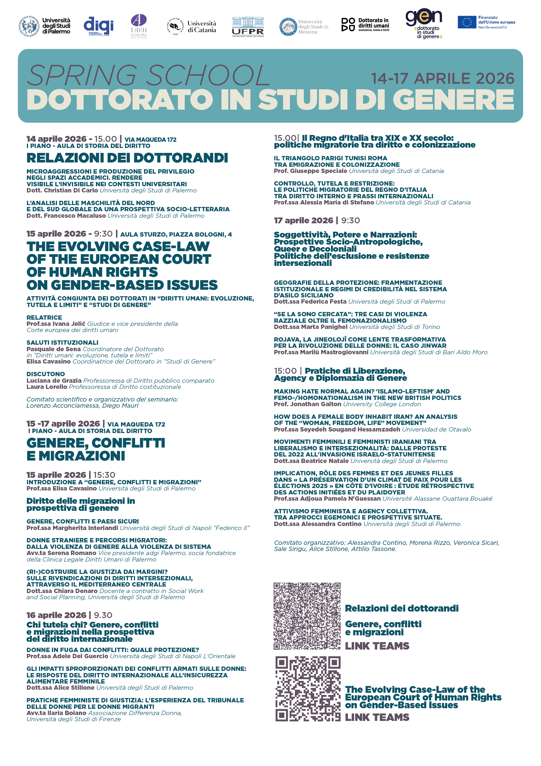 Dal 14 al 17 aprile 2026, la Spring School promossa dal Dottorato in Studi di Genere propone quattro giornate di studio e confronto sui nessi tra diritto, migrazioni, conflitti, politiche della protezione, resistenze intersezionali e prospettive queer e decoloniali.