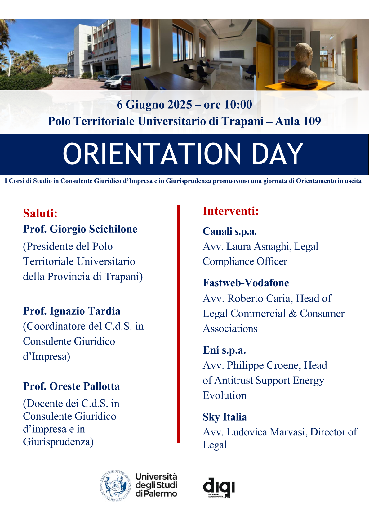 Per prenotare un incontro con i Delegati e i Docenti del CdL in Consulente giuridico d’impresa al fine di ricevere informazioni e personalizzare il proprio percorso formativo, contattare per email il Prof. Alessandro Purpura, Delegato per l’orientamento e il tutorato, alessandro.purpura@unipa.it