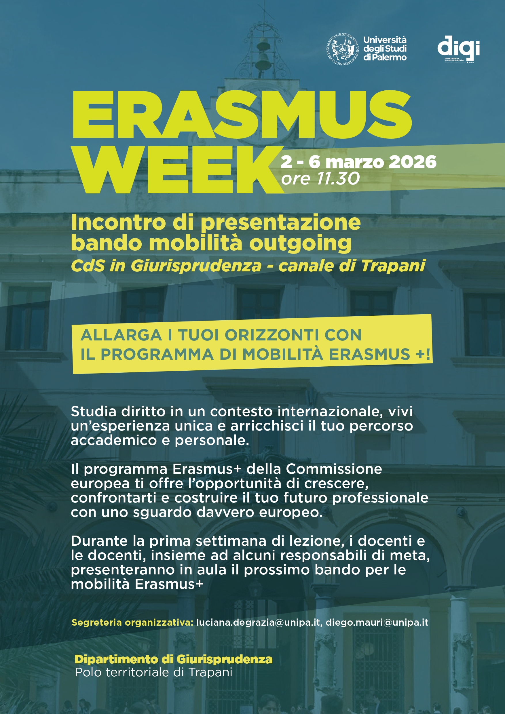Per prenotare un incontro con i Delegati e i Docenti del CdL in Giurisprudenza (sede di Trapani) al fine di ricevere informazioni sul CdL in Giurisprudenza e personalizzare il proprio percorso formativo contattare per email la Prof.ssa Lalage Mormile, Delegata per l’orientamento e il tutorato: lalage.mormile@unipa.it