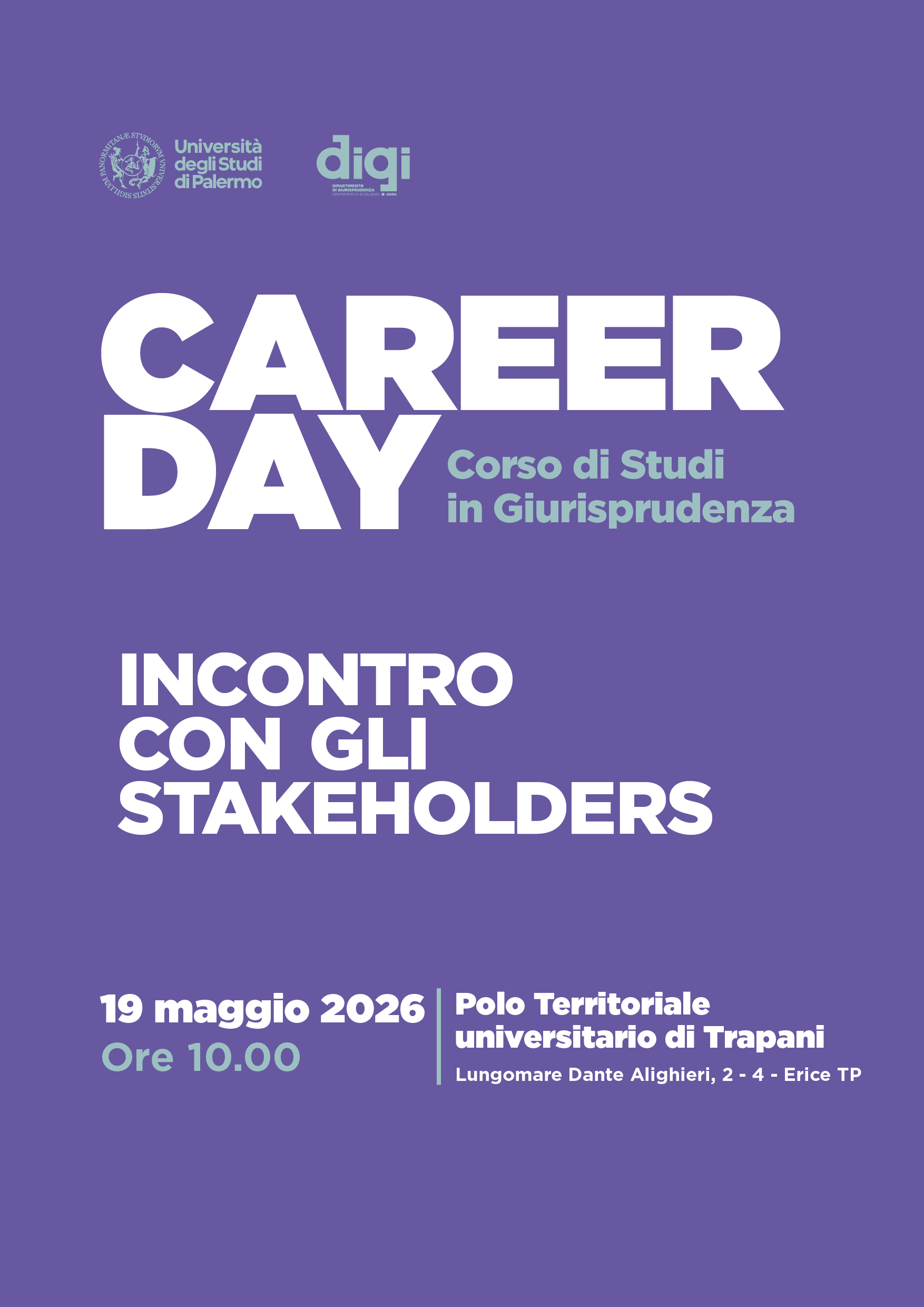 Martedì 19 maggio 2026, alle ore 10.00, il Polo Territoriale universitario di Trapani, a Erice, ospiterà il career day del corso di Studi in Giurisprudenza del Dipartimento di Giurisprudenza dell’Università degli Studi di Palermo.