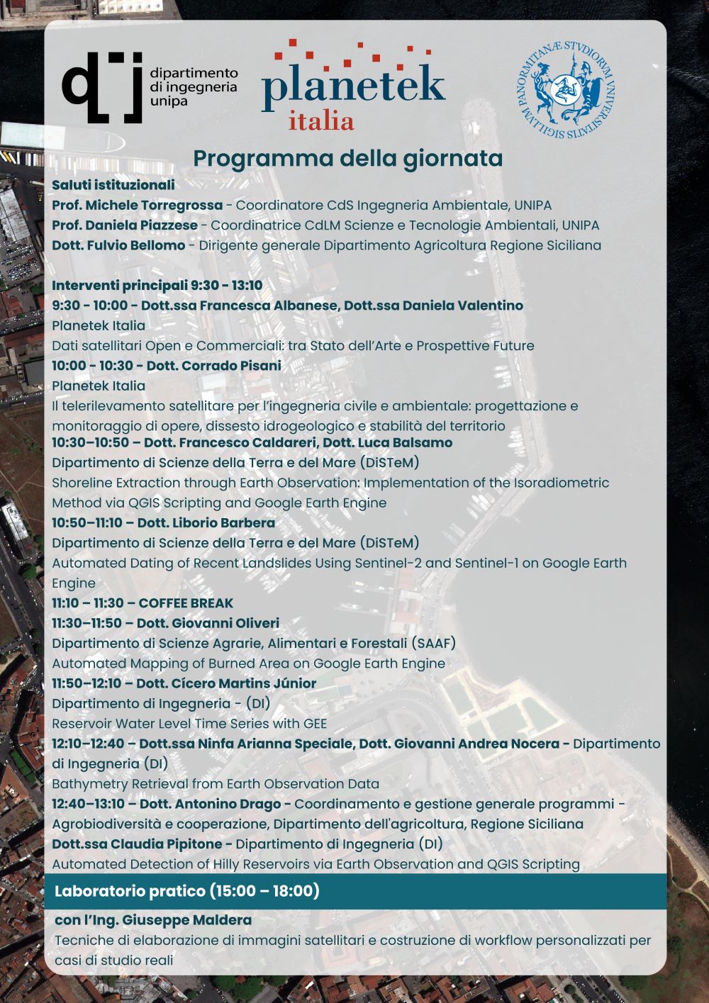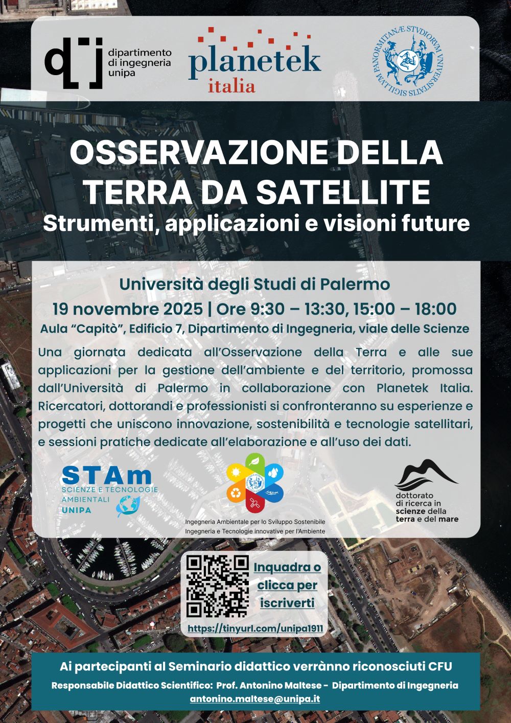 Osservazione della Terra da satellite - Strumenti, applicazioni e visioni future 27-ott-2025 Ascolta 19 novembre 2025 Ascolta La partecipazione documentata all'evento darà diritto ad 1 CFU nell'ambito delle ALTRE ATTIVITA' UTILI PER L'INSERIMENTO NEL MONDO DEL LAVORO (OTHER KNOWLEDGE USEFUL FOR JOB PLACEMENT). Parole Chiave: articolo, notizia, unipa
