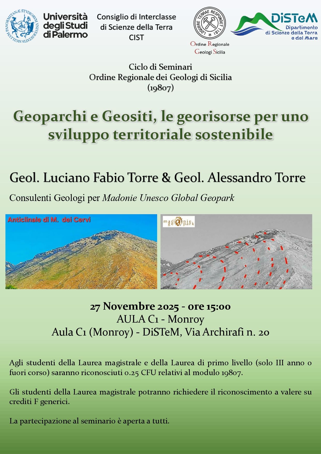 Seminario: Geoparchi e Geositi, le georisorse per uno sviluppo territoriale sostenibile 14-nov-2025 Ascolta 27 novembre 2025 ore 15:00 aula C1 Ascolta Parole Chiave: articolo, notizia, unipa