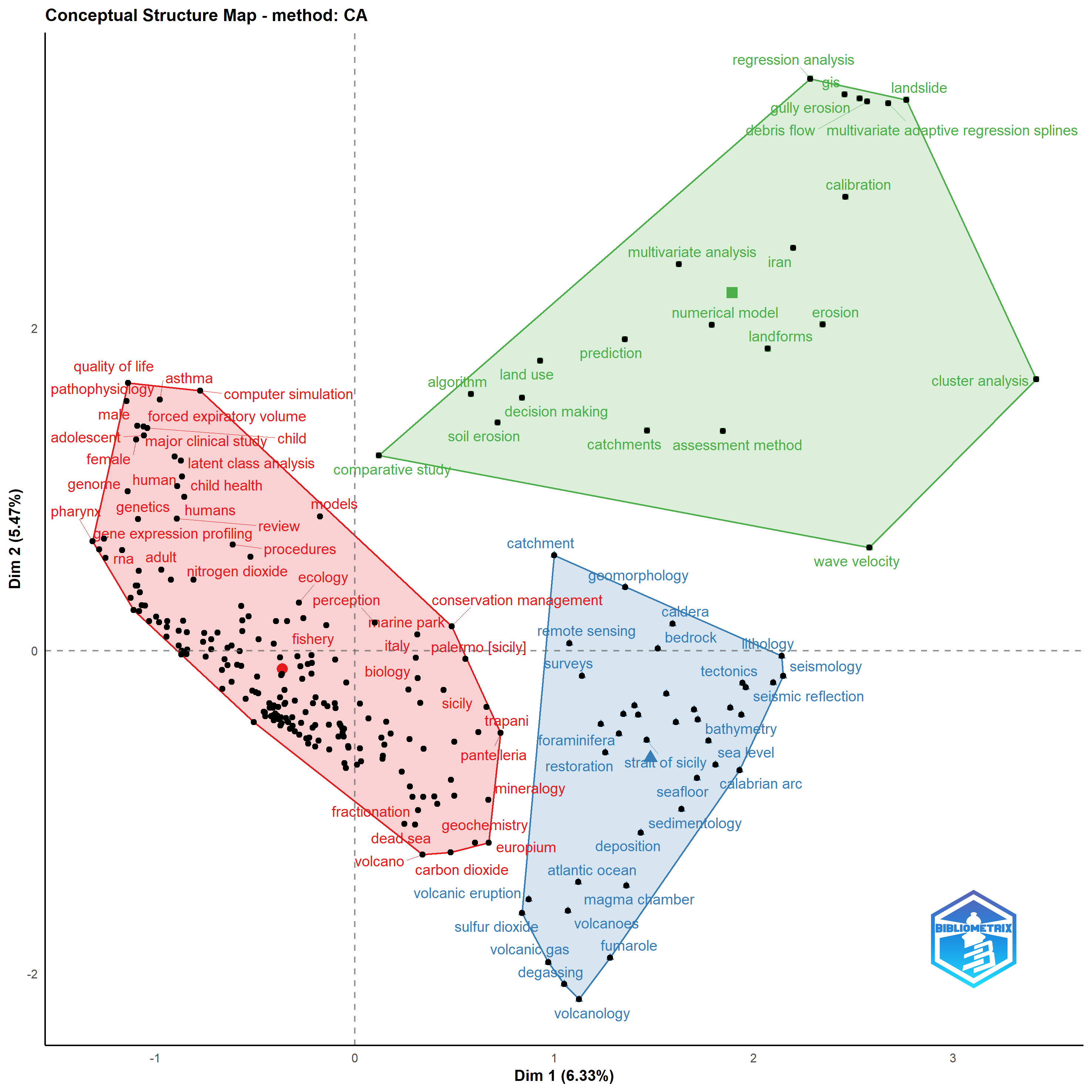 Keyword conceptual map the structure: based on the keywords, the graph highlights three clusters. The red cluster groups together scientific production linked to marine ecology, biology and conservation; The blue cluster groups geomorphology, sedimentology, seismology and volcanology with scientific production; the green cluster is linked to scientific production concerning the use of advanced statistical analysis techniques.