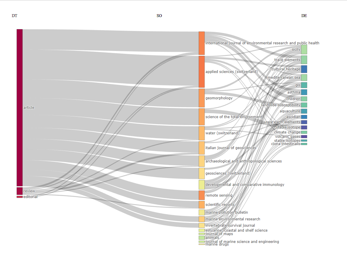 Three Fields Plot: il grafico mostra i principali item per tipo dsi pubblicazione, riviste e parole chiave. La maggior parte della produzione scientifica del DiSTeM consta di articoli originali, le principali riviste (solo le prime 20 mostrate) rientrano nell'ambito della ricerca ambientale e delle geoscienze.
