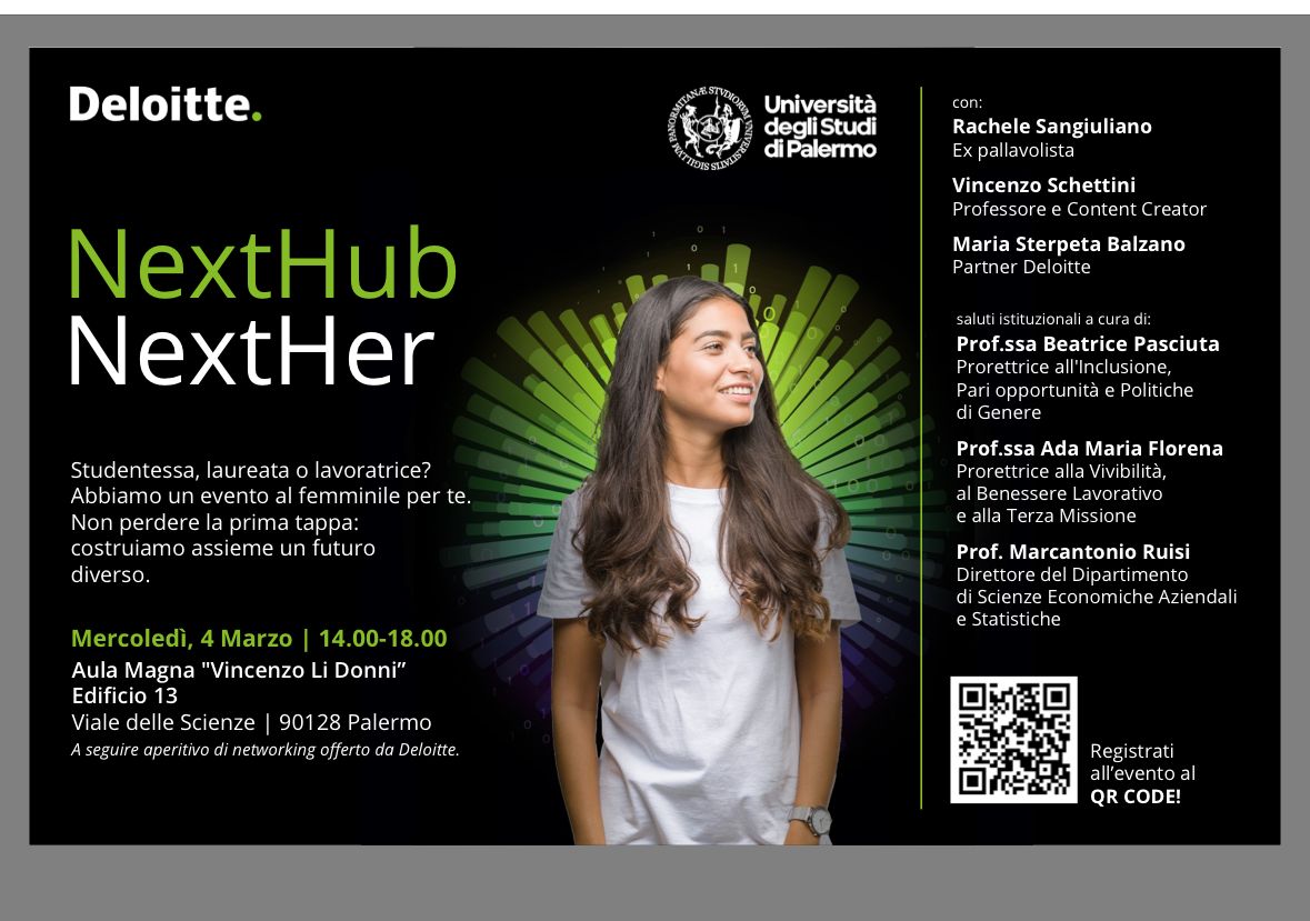 Mercoledì 4 marzo, alle 14.00, nell'Aula Magna "Vincenzo Li Donni" del Dipartimento di Scienze Economiche, Aziendali e Statistiche - SEAS (Ed. 13 del Campus di viale delle Scienze), si tiene l'evento "NextHub NextHer".