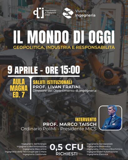 Il Dipartimento di Ingegneria è lieto di invitare la comunità accademica e gli studenti al seminario “Il Mondo di Oggi: Geopolitica, Industria e Responsabilità”. L'evento rappresenta un'importante occasione di riflessione e confronto sulle complesse dinamiche che legano gli attuali scenari geopolitici all'evoluzione del settore industriale e alle responsabilità d'impresa.