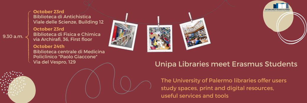 Agli eventi sono invitati tutti gli studenti incoming Erasmus del primo semestre per fornire loro informazioni sui servizi offerti dalle Biblioteche dell'Ateneo di Palermo.