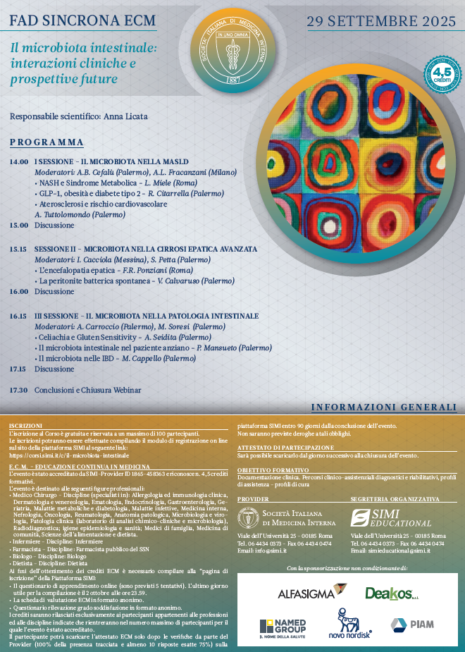 Il microbiota intestinale: interazioni cliniche e prospettive future 29-set-2025 Ascolta FAD SINCRONA ECM Il microbiota intestinale: interazioni cliniche e prospettive future 29 SETTEMBRE 2025 Responsabile scientifico: Anna Licata CREDITI ECM n. 4,5 PROGRAMMA Parole Chiave: articolo, notizia, unipa, microbiota intestinale, promise, terza missione, ECM, Anna Licata, specializzazioni, dottorato